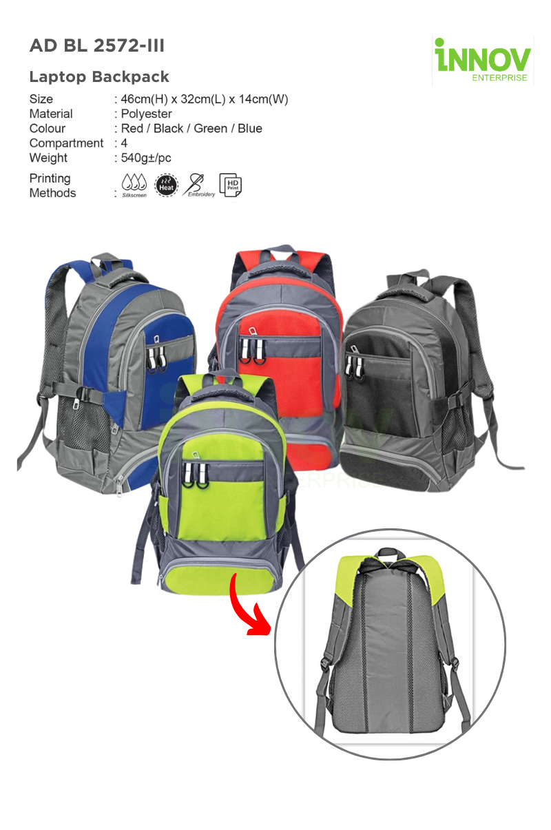 The AD BL 2572-III Laptop Backpack is a durable, stylish, and functional choice for professionals, students, and active individuals who need a reliable and spacious storage solution. Crafted from high-quality polyester, this lightweight yet sturdy backpack weighs 540g ± per piece, ensuring comfort and durability for daily use.