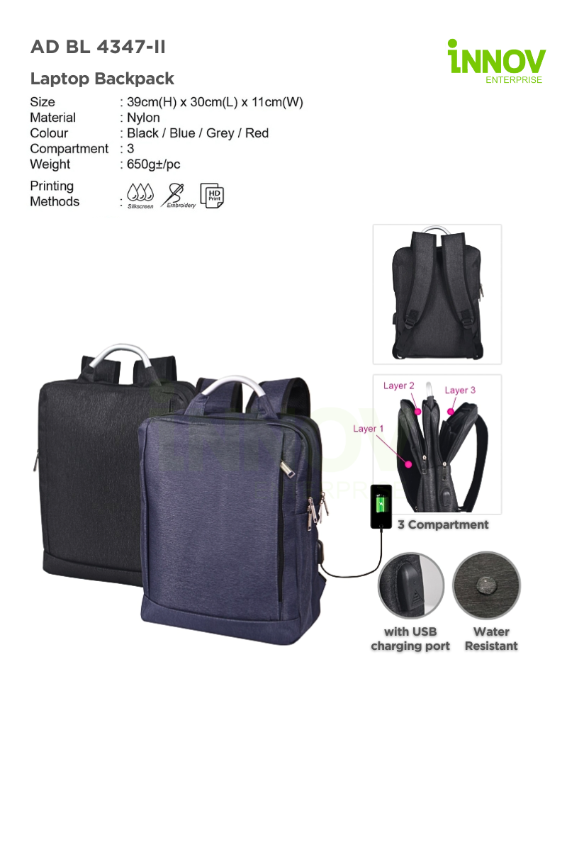 For corporate branding and promotions, the AD BL 4347-II Laptop Backpack offers custom branding options with Silkscreen, HD Print, or Embroidery, with a large printing area of 14cm (W) x 18cm (H) to showcase your company logo, promotional branding, or personal customization.
