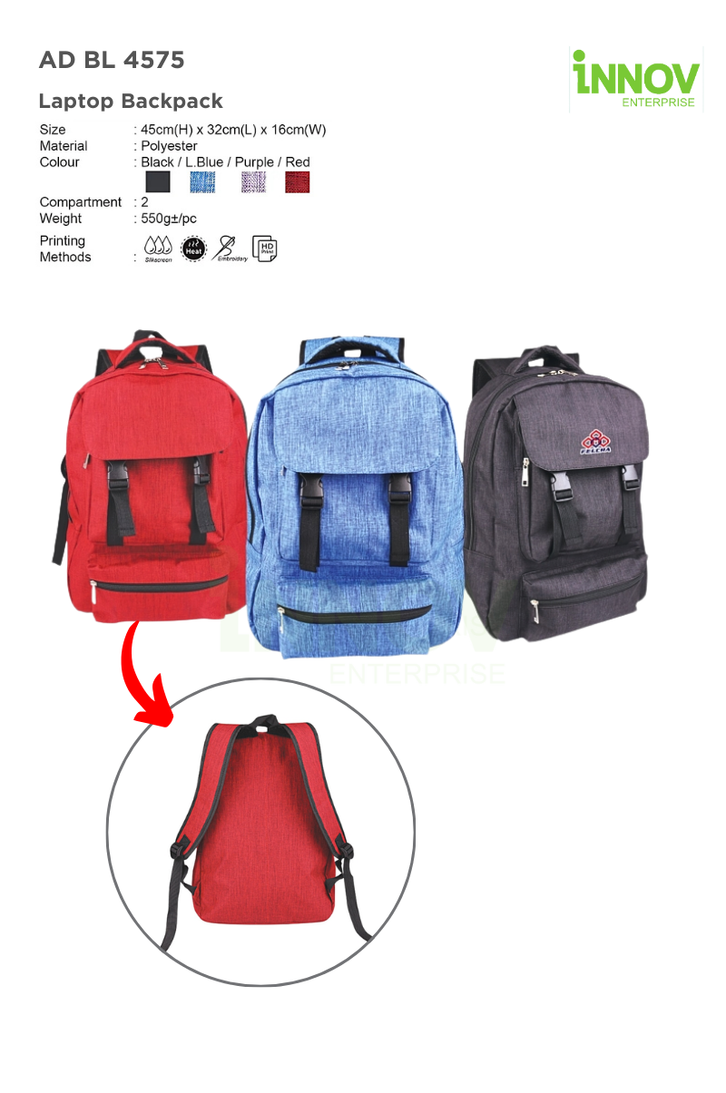 For branding opportunities, the BL 4575 Laptop Backpack is customizable with Silkscreen, HD Print, Embroidery, or Heat Transfer, making it perfect for corporate giveaways, promotional gifts, and business branding. Whether for work, travel, or daily activities, this polyester laptop backpack is the ultimate companion for carrying essentials with ease and style.