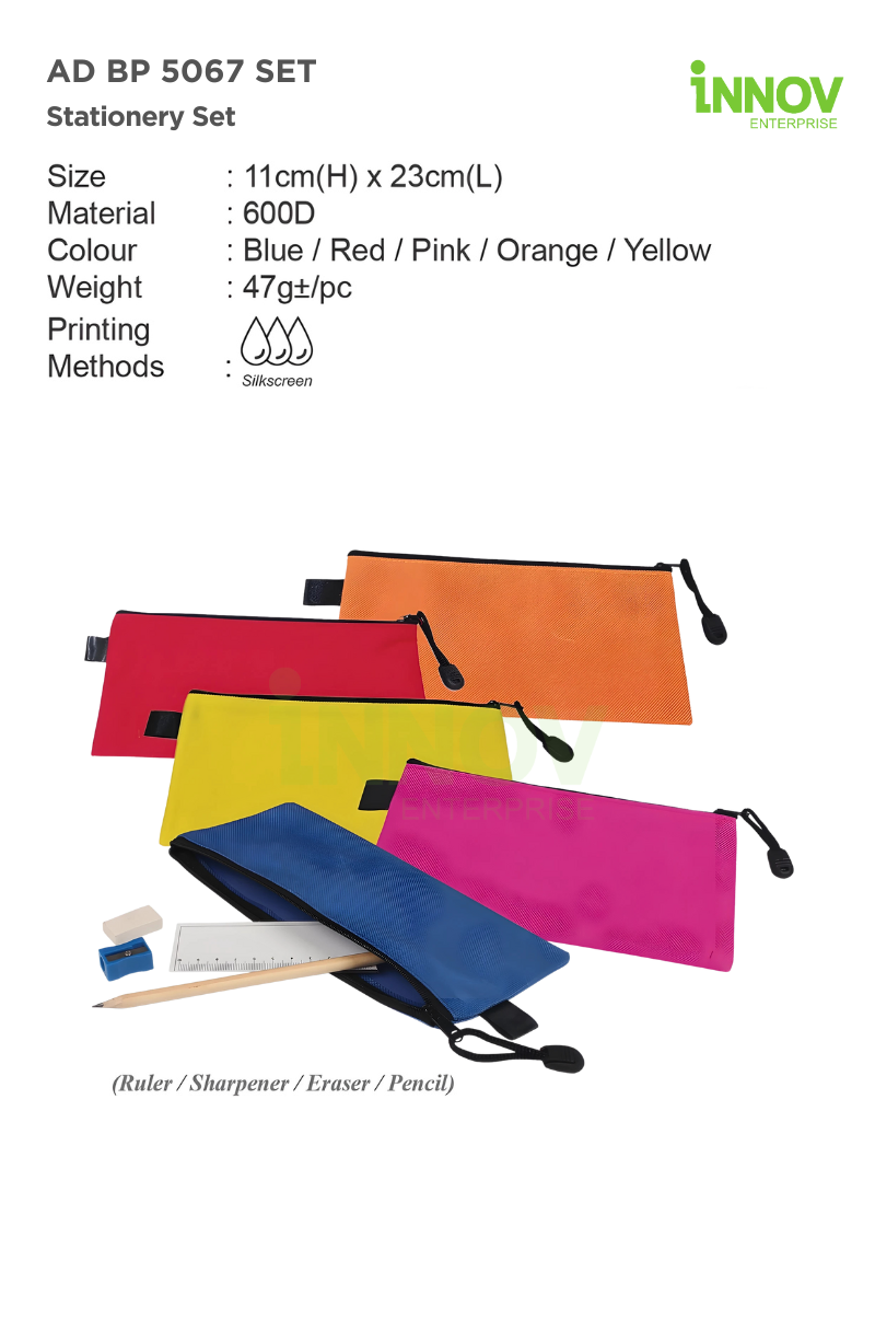 The AD BP 5067 SET Pencil Pouch Set is a smart and practical choice for schools, offices, and promotional events. Packed with a ruler, sharpener, eraser, and pencil inside a durable 600D zippered pouch, it keeps essentials neatly organised while doubling as a versatile branding tool.