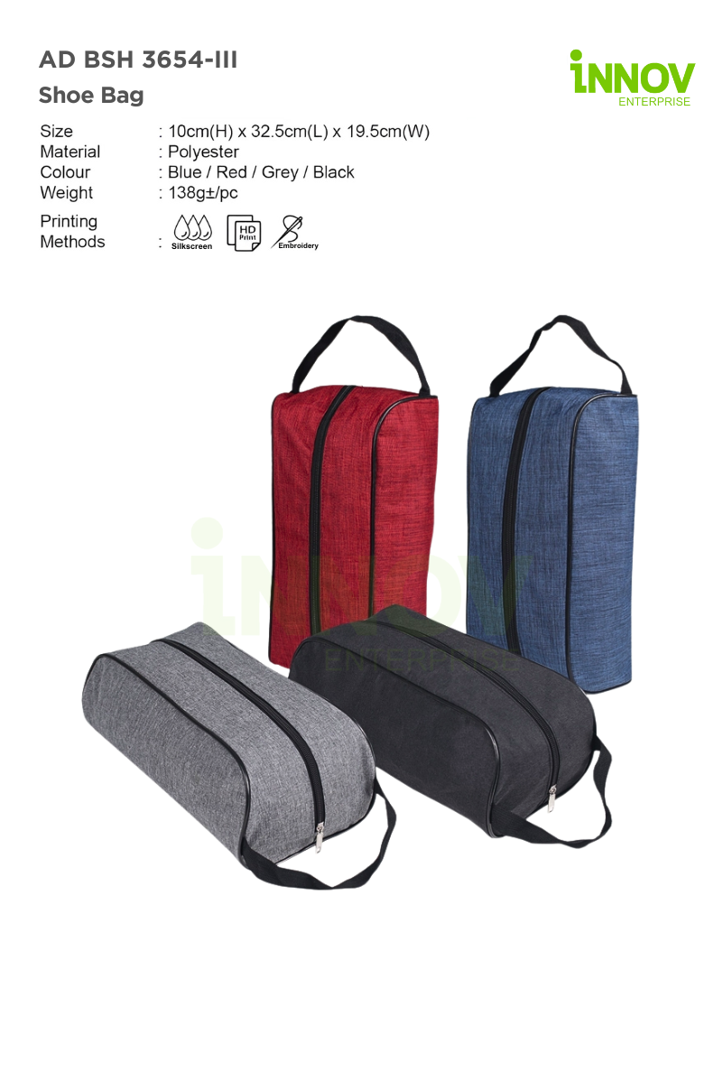 Available in four stylish colours—the BSH 3654-III Shoe Bag features a sturdy handle for effortless carrying and a secure zipper closure to keep your belongings safe. The breathable construction ensures freshness, while the sleek, minimalist design makes it suitable for both personal use and corporate giveaways. For businesses and organizations, this travel shoe organizer offers a generous printing area of 18cm (W) x 8cm (H), ideal for custom branding through silkscreen, HD print, or embroidery. Whether you’re looking to promote your brand, create team gear, or give personalized gifts, the BSH 3654-III Shoe Bag delivers functionality with a professional touch.