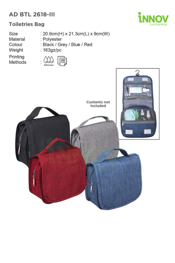 With custom branding options including Silkscreen and HD Print, the AD BTL 2618-III Toiletries Bag is a great corporate gift, promotional item, or travel essential for companies looking to enhance their brand presence.