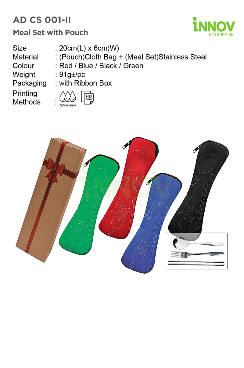 The AD CS 001-II Meal Set with Pouch, a sleek and practical personalised cutlery set designed for everyday convenience and corporate gifting. This 3-piece set includes a stainless steel spoon, fork, and chopsticks, all housed in a durable and colourful zippered cloth pouch that’s both reusable and washable.