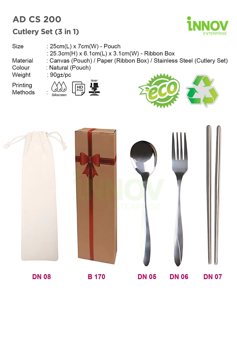 At Innov Enterprise, we help you turn the AD CS 200 Cutlery Set (3 in 1) into a standout customised cutlery set for your brand: