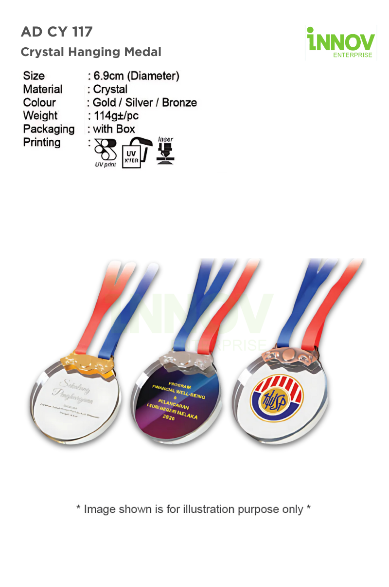 Available in Gold, Silver, and Bronze finishes, the AD CY 117 adds structure to your award tiers—ideal for academic competitions, sporting achievements, and corporate milestones. Its polished crystal face is perfect for showcasing your brand, event title, or recipient name with high-precision UV Print, UV Transfer, or Laser Engraving.