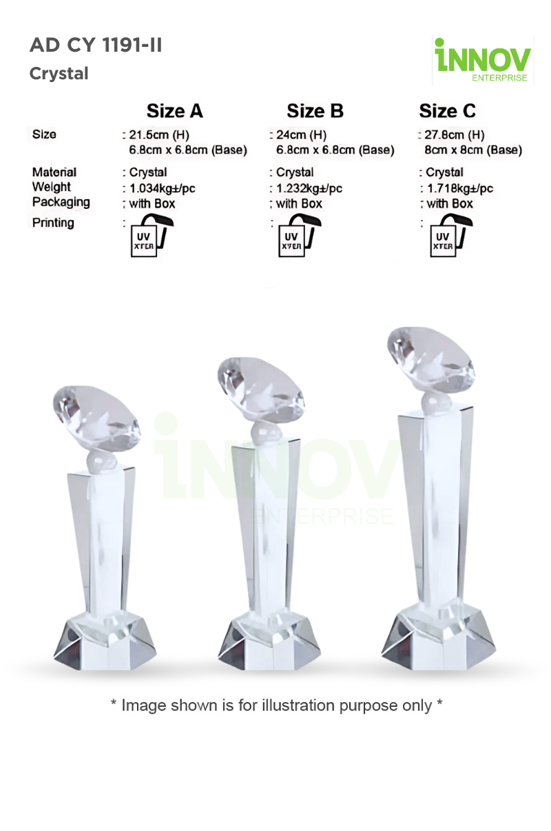 Crafted entirely from premium crystal, the AD CY 1191-II offers a sleek and polished surface that is ideal for UV transfer printing, allowing custom logos, names, and messages to appear sharp and professional.
