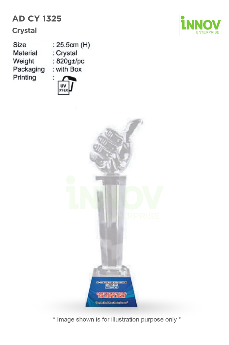With a height of 25.5cm and weighing approximately 820g±/pc, the AD CY 1325 is lightweight yet impactful—perfect for corporate awards, educational honours, sports events, or team celebrations that deserve more than just a thank you.