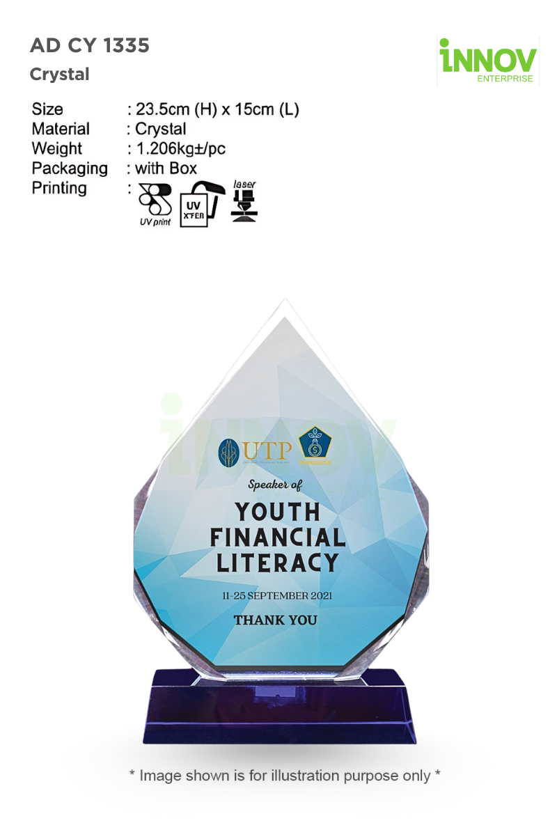 • Key Features: Distinctive teardrop silhouette with multifaceted edges, smooth crystal surface ideal for personalised logos and text, elegant blue crystal base for added visual presence