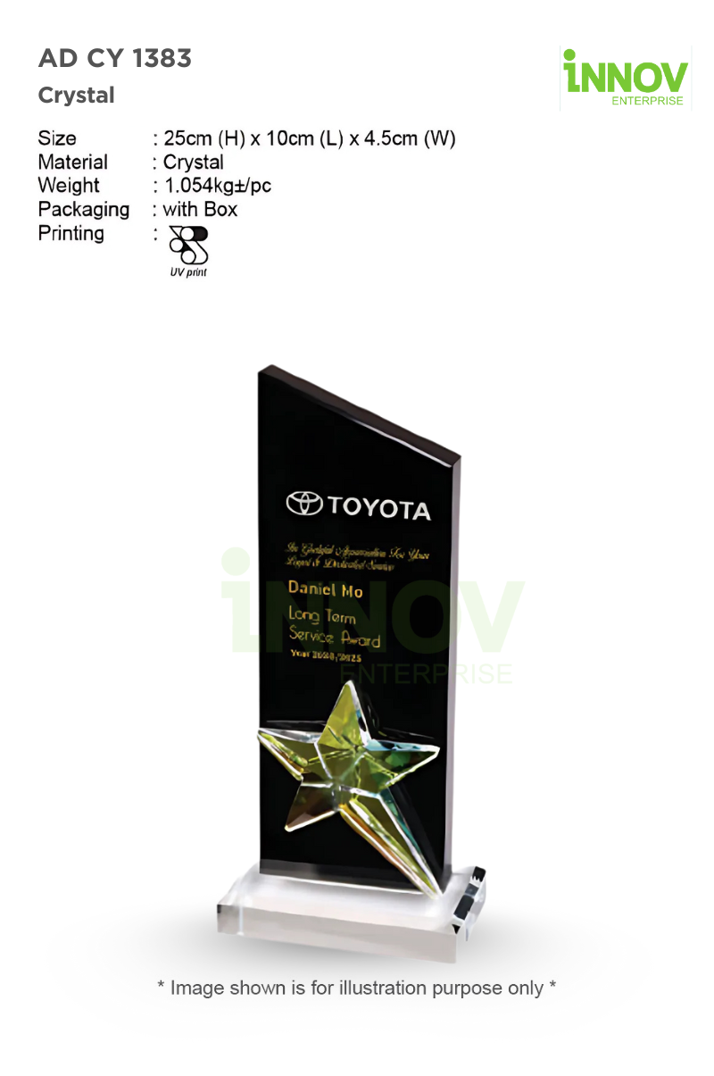 Measuring 25cm (Height) x 10cm (Length) x 4.5cm (Width) and weighing approximately 1.054kg per piece, the AD CY 1383 delivers both a premium look and substantial feel—making it an ideal centrepiece for any corporate celebration or award event.