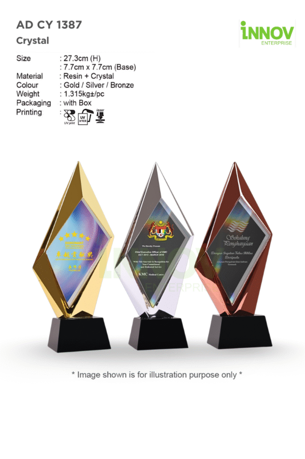 Available in Gold, Silver, and Bronze finishes, the AD CY 1387 Crystal can be used to distinguish award tiers or special honours. Each piece is individually boxed for protection and presentation, ensuring it arrives ready to impress at conferences, galas, or team recognition events.