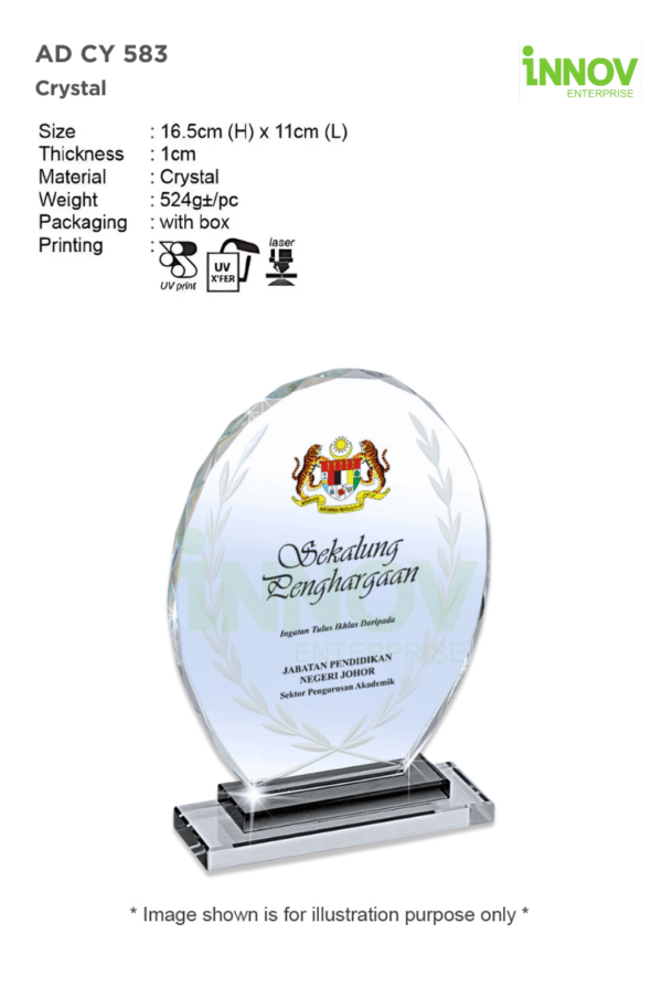 The AD CY 583 Crystal offers a timeless and refined way to honour achievement with grace. Crafted from high-quality 1cm thick crystal, this oval-shaped Crystal Plaque Award is adorned with a laurel motif—symbolising victory, honour, and distinction. Its compact size of 16.5cm (H) x 11cm (L) and weight of 524g±/pc with smooth, polished finish make it a perfect fit for formal presentations, whether in corporate settings, educational institutions, or community recognition events.