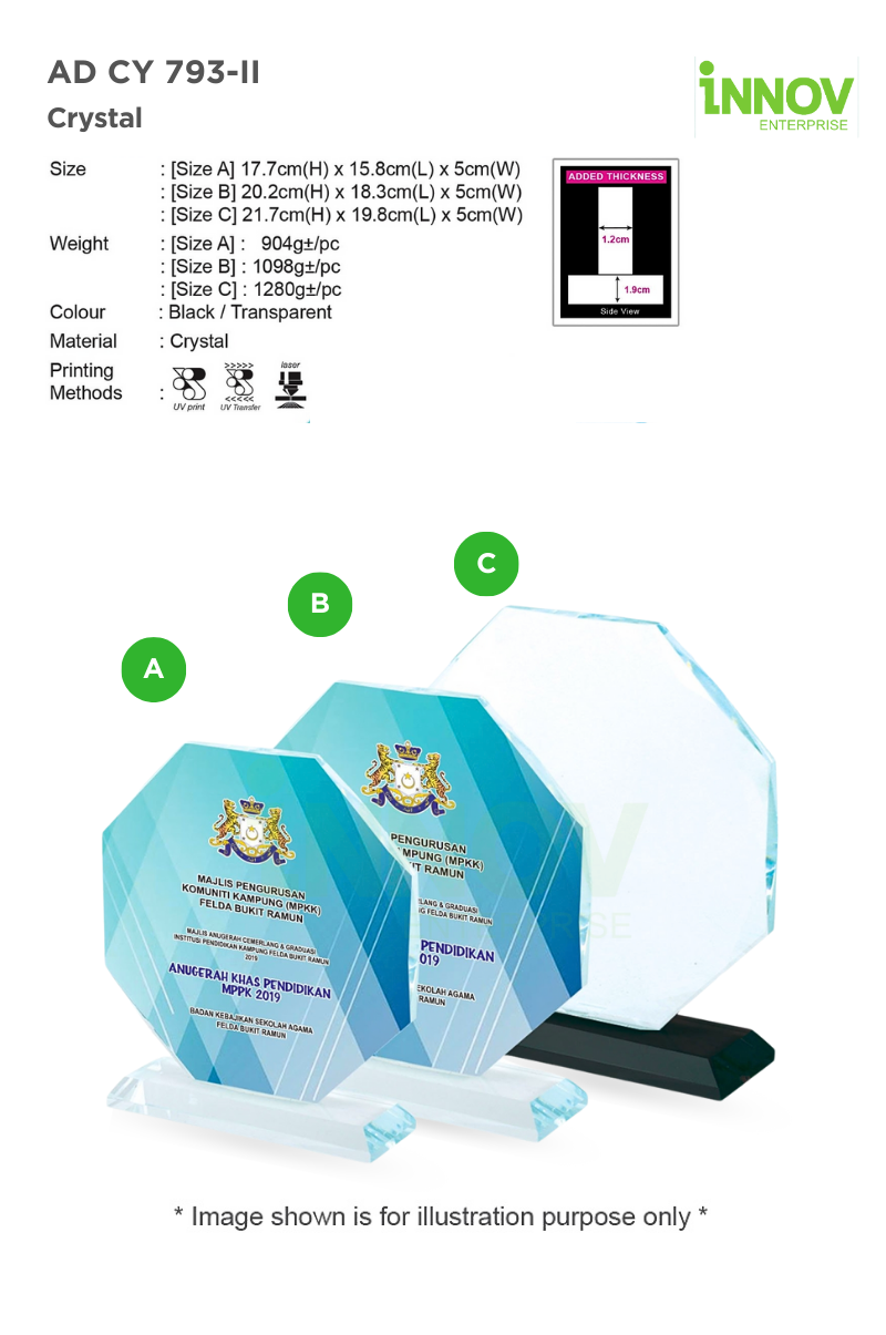 Its enhanced 1.2cm crystal face and 1.9cm base add both durability and impact—ensuring it stands out visually and remains stable during presentations. Available in transparent or black base colour options, the AD CY 793-II caters to a range of award styles, from formal corporate ceremonies to creative commemorative events.