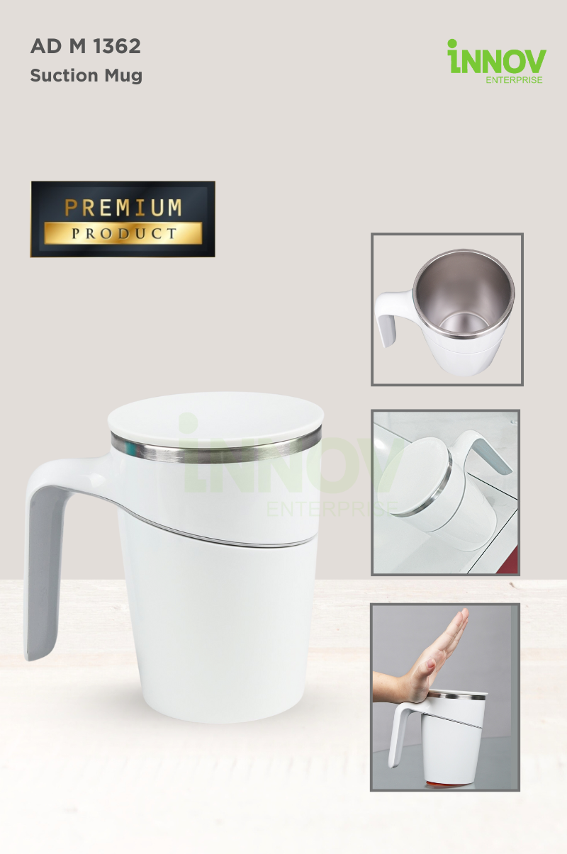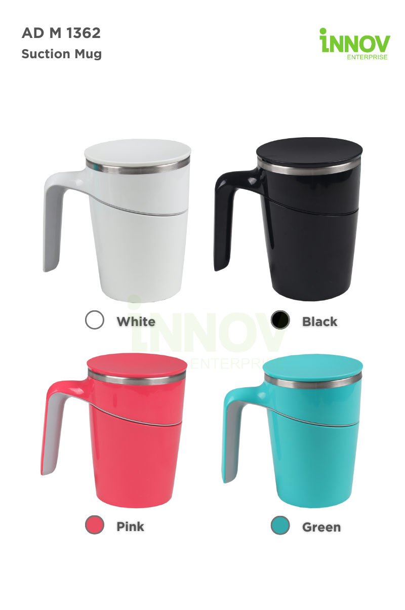 The AD M 1362 Suction Mug is a sleek and functional suction mug with logo customisation designed for everyday use in the workplace, classroom, or home. Featuring a smart suction base, this 470ml mug resists accidental knocks and tipping—yet lifts easily when picked up straight, making it ideal for busy desks and shared environments.
