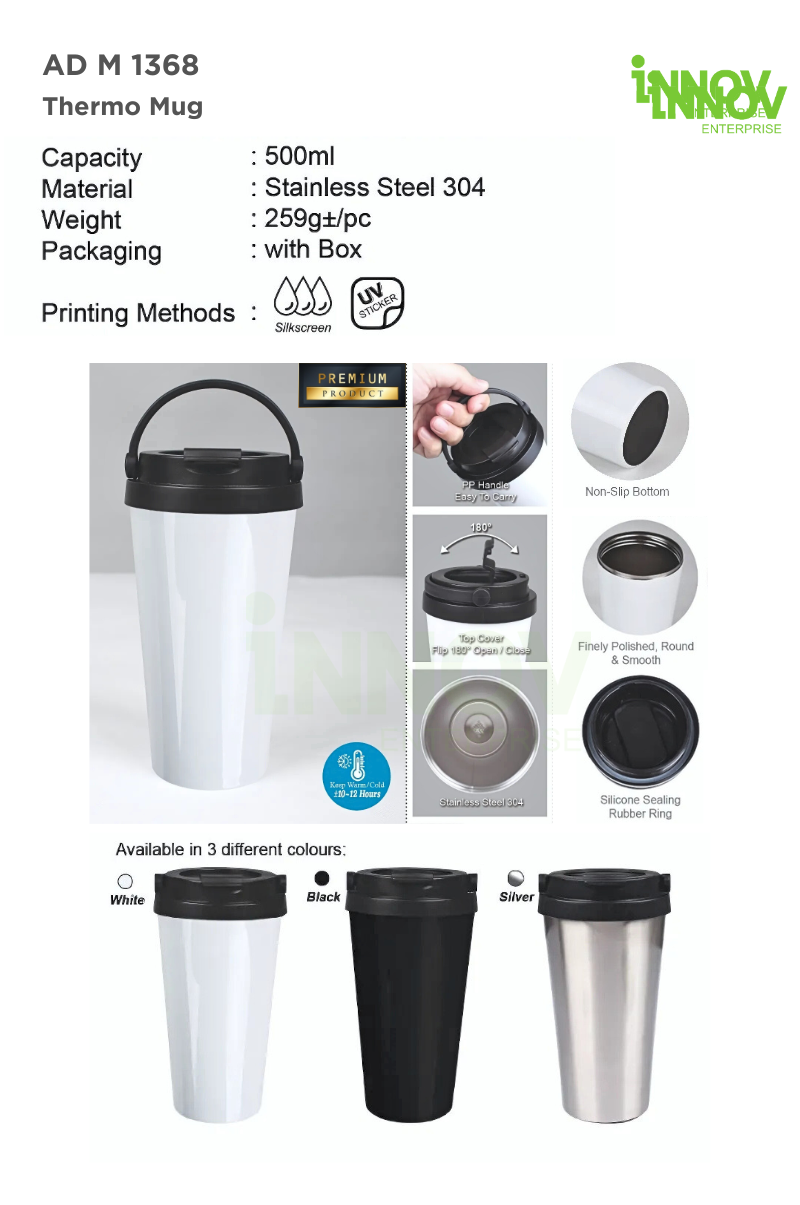 The AD M 1368 Customised Thermal Mug is a 500ml stainless steel drinkware solution crafted for those who value performance, aesthetics, and durability. Built from food-grade Stainless Steel 304, this mug keeps beverages hot or cold for 8 to 12 hours—perfect for daily commutes, office desks, or outdoor use.