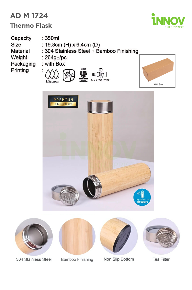 The AD M 1724 Thermo Flask is a compact and elegant bamboo thermal flask designed for sustainable gifting, office hydration, and wellness promotions. With its premium natural bamboo exterior and 304 stainless steel interior, this 350ml bottle keeps beverages warm or cold for up to 12 hours—offering both function and refined presentation.
