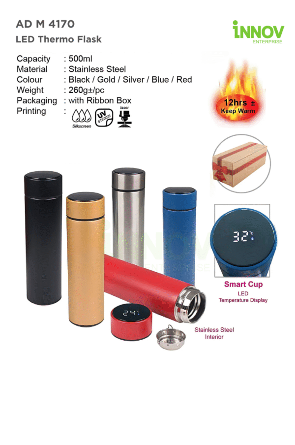 The AD M 4170 LED Thermo Flask is the ideal smart vacuum flask for busy professionals and brand-conscious companies. Equipped with a built-in LED temperature display, this innovative drinkware lets users check their beverage’s temperature instantly with a simple tap—no charging or batteries required. Whether it’s tea, coffee, or fruit-infused water, every sip is stylish, safe, and satisfying.