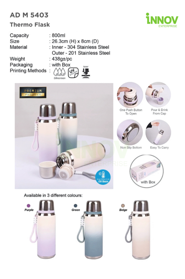 The AD M 5403 Thermo Flask is a stylish and functional 800ml insulated bottle, purpose-built for those who value convenience, style, and performance. Featuring premium stainless steel construction—with a 304-grade inner layer for hygiene and a sleek 201 outer finish—this flask is ideal for long-lasting use and high-visibility thermo flask printing.