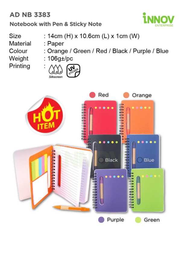 Crafted from durable paper with a sturdy spiral binding, it features a lined writing pad, colourful sticky notes, and a matching eco-friendly pen—all in one portable package. Measuring 14cm (H) × 10.6cm (L) × 1cm (W) and weighing just 106g ±/pc, this lightweight notepad set fits easily into bags, folders, or pockets, making it ideal for professionals, students, and event giveaways.