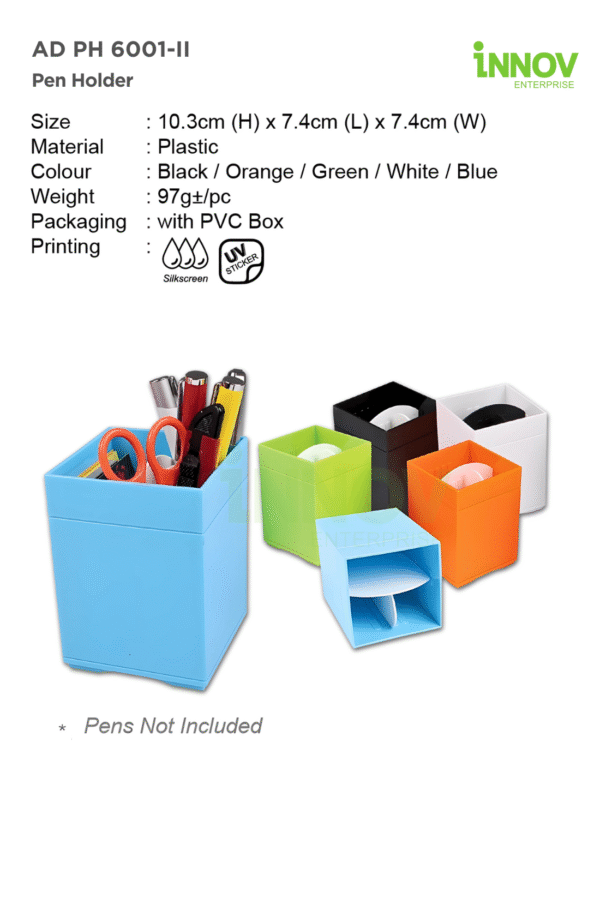 Order Now! Keep desks tidy while promoting your brand with the AD PH 6001-II Pen Holder. Add to quote or contact us today for a free consultation and personalised quotation!