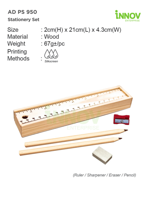 The AD PS 950 Stationery Set is a classic, eco-friendly option designed for students, professionals, and corporate gifting. Crafted from durable wood , it combines functionality with natural appeal, making it a timeless choice for daily use or promotional events. This Wood Pencil Case Set features a compact wooden box that doubles as both a protective case and a ruler, offering added practicality in a lightweight design.