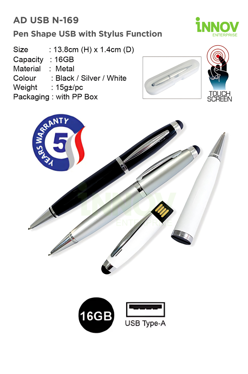 Available in 3 colours, the AD USB N-169 offers exceptional versatility for corporate gifting, executive branding, and event giveaways. Whether used for signing documents, presenting in meetings, or storing files on the go, this Stylus Pen USB combines form, function, and style in one compact design.