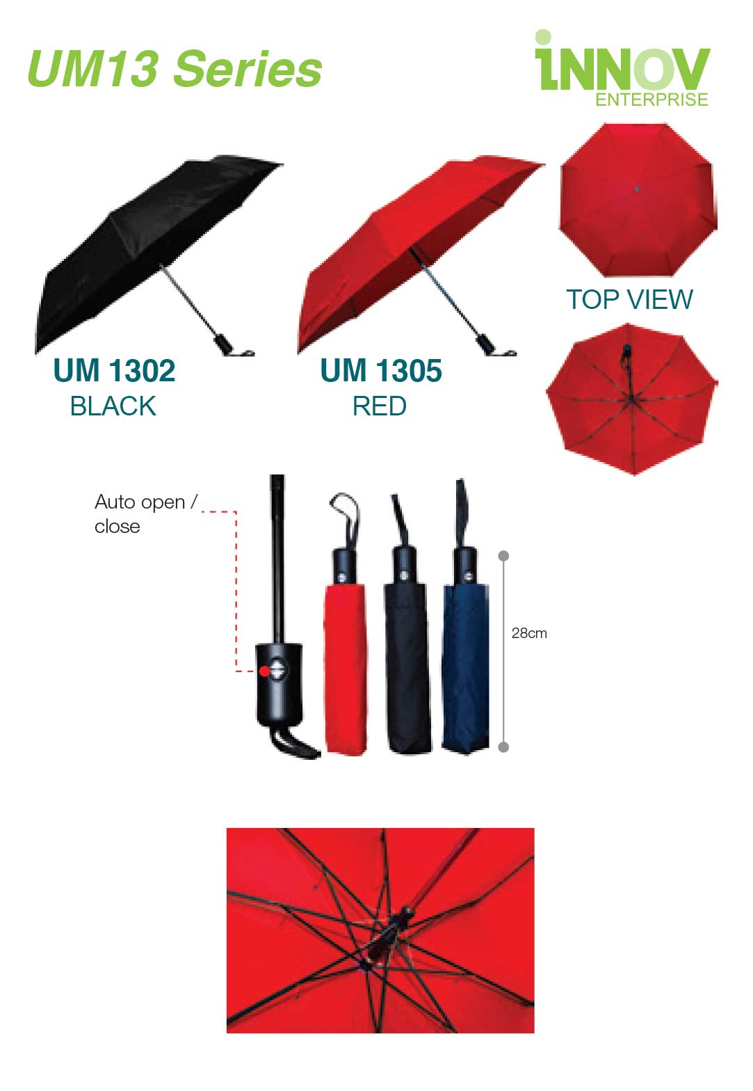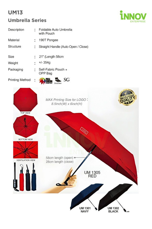 The UM13 Umbrella Series is a convenient Compact Automatic Umbrella designed for daily use, commuting, and corporate gifting. Its one-press auto open/close function provides quick protection during sudden weather changes. Made from 190T pongee fabric, it offers a smooth, water-resistant finish with a comfortable straight handle. Compact at 28cm when closed and weighing ±354g, it’s easy to carry while still providing reliable 21″ (58cm) coverage.