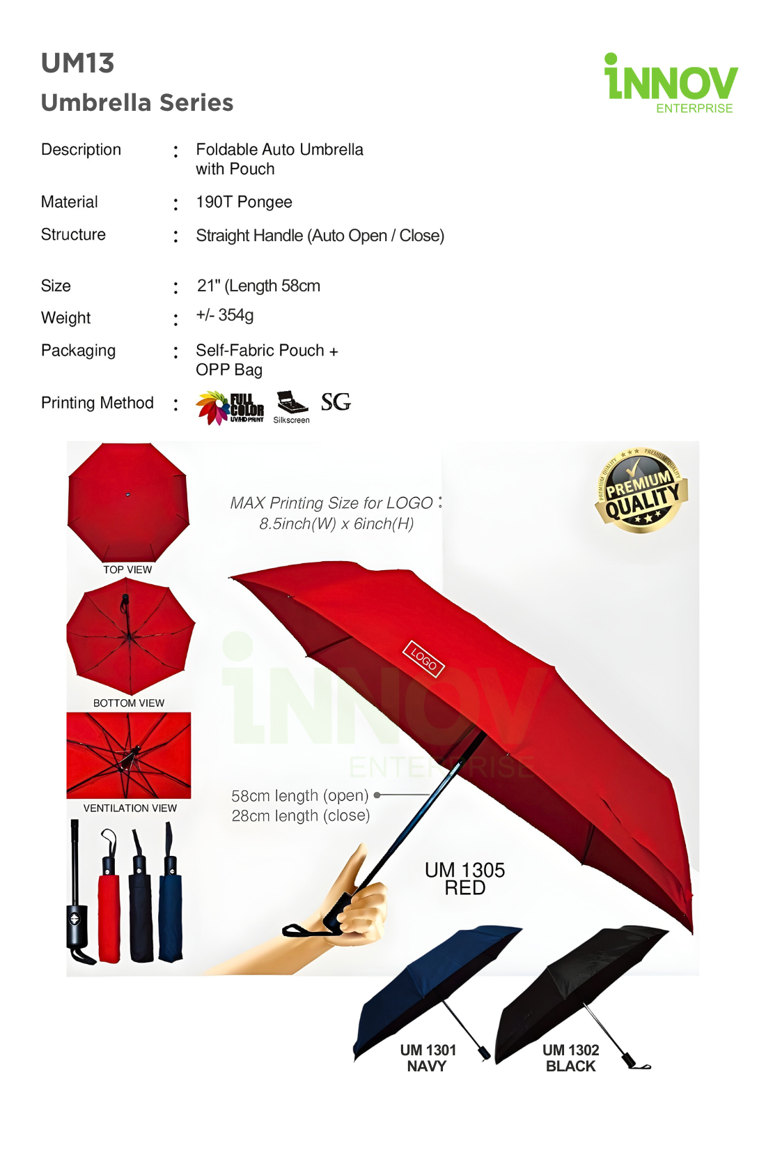 At Innov Enterprise, we offer versatile branding methods to personalise your Compact Automatic Umbrella: