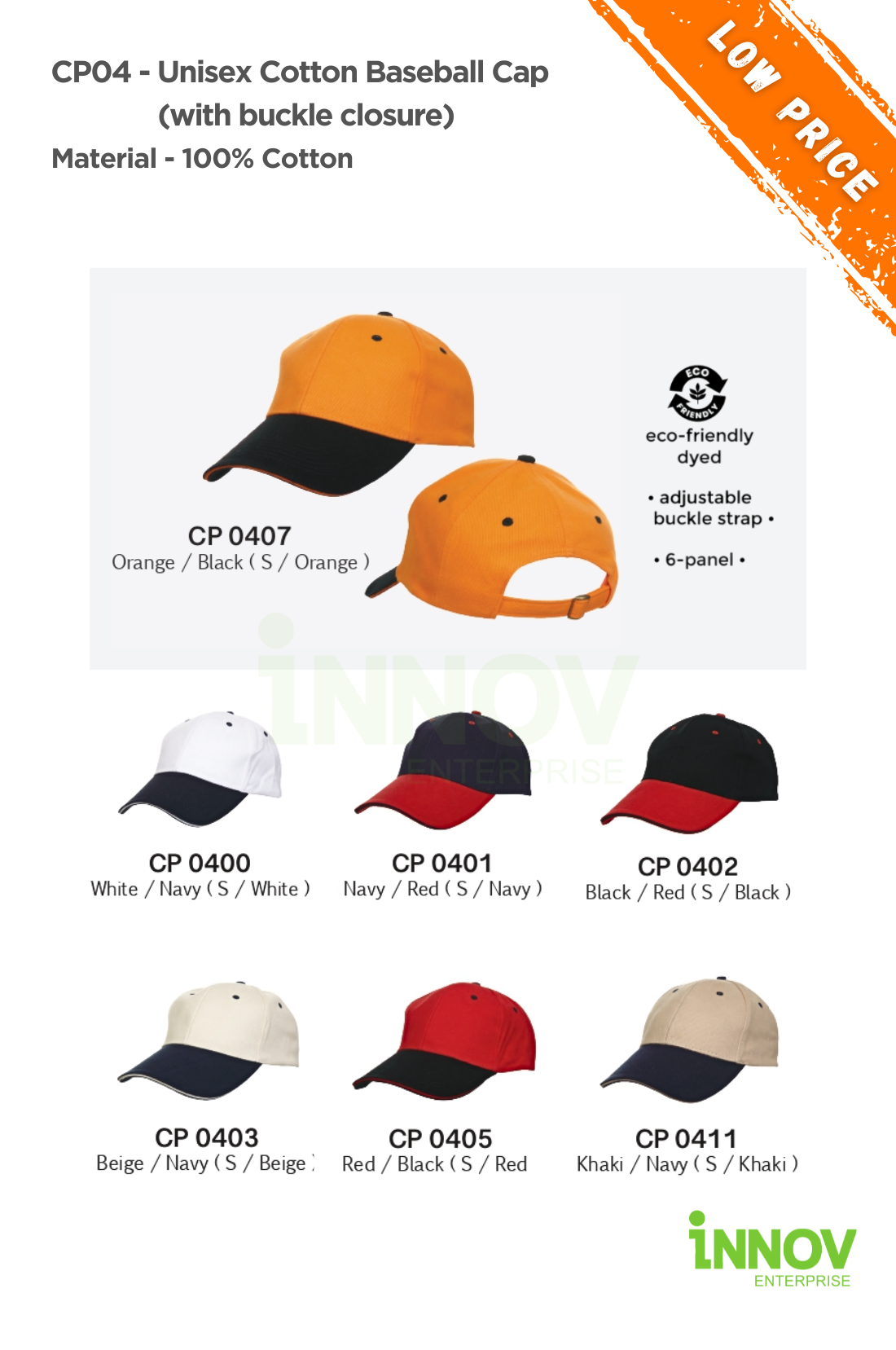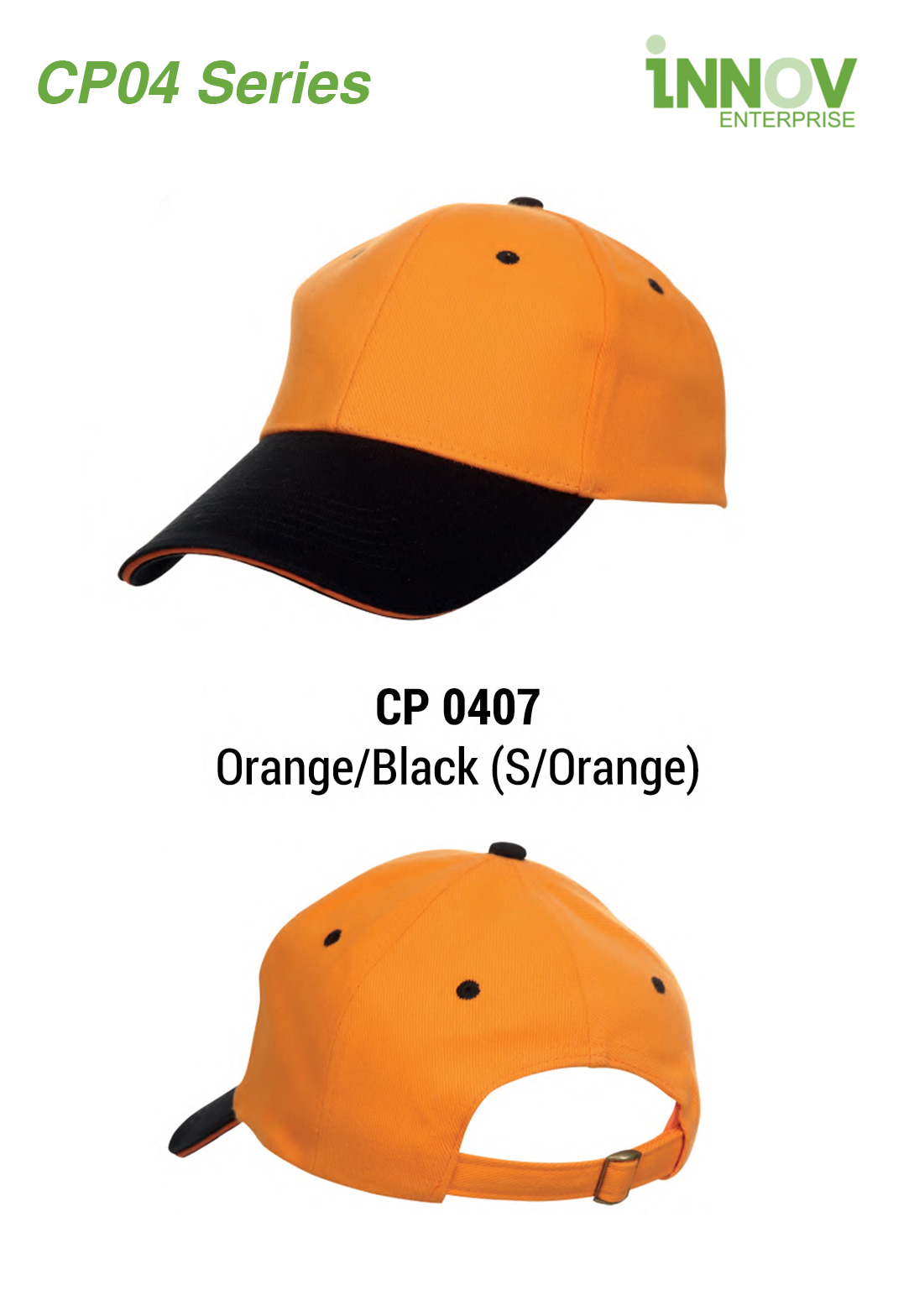 This series of plain cotton baseball cap has 2 colours. For this cap design, it uses black to match with the commonly used colours such as white, black, orange, beige and khaki colour on it’s peak. It also comes with a metal buckle for you to adjust the cap size.