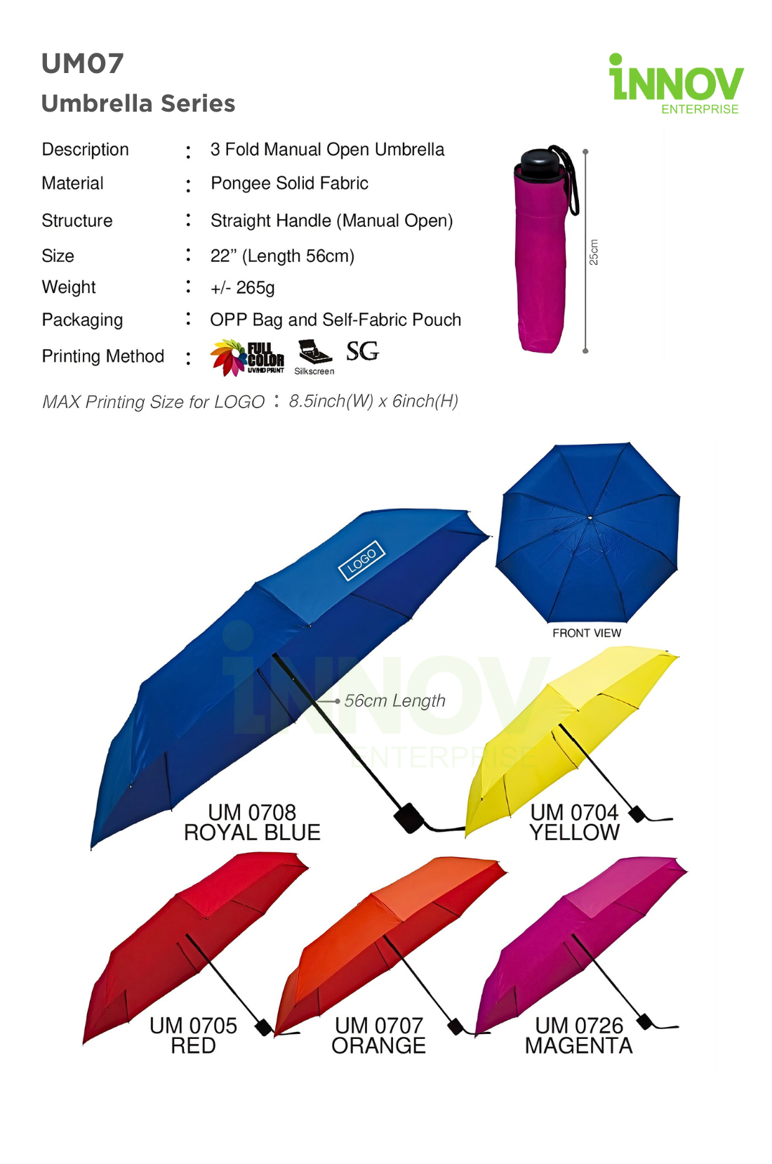 At Innov Enterprise, we offer versatile branding methods to personalise your 3 Fold Umbrella: