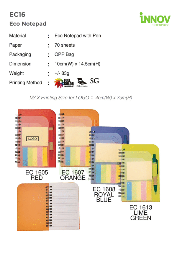 The EC16 Eco Notepad is a lightweight and convenient Custom Daily Notepad designed for events, training sessions, educational programmes and corporate giveaways. Featuring an eco-style cover with a matching pen, this notepad offers a simple and organised way for users to take notes on the go. Its translucent design with built-in sticky notes adds extra functionality for marking pages and organising tasks—making it a practical and attractive gift option.