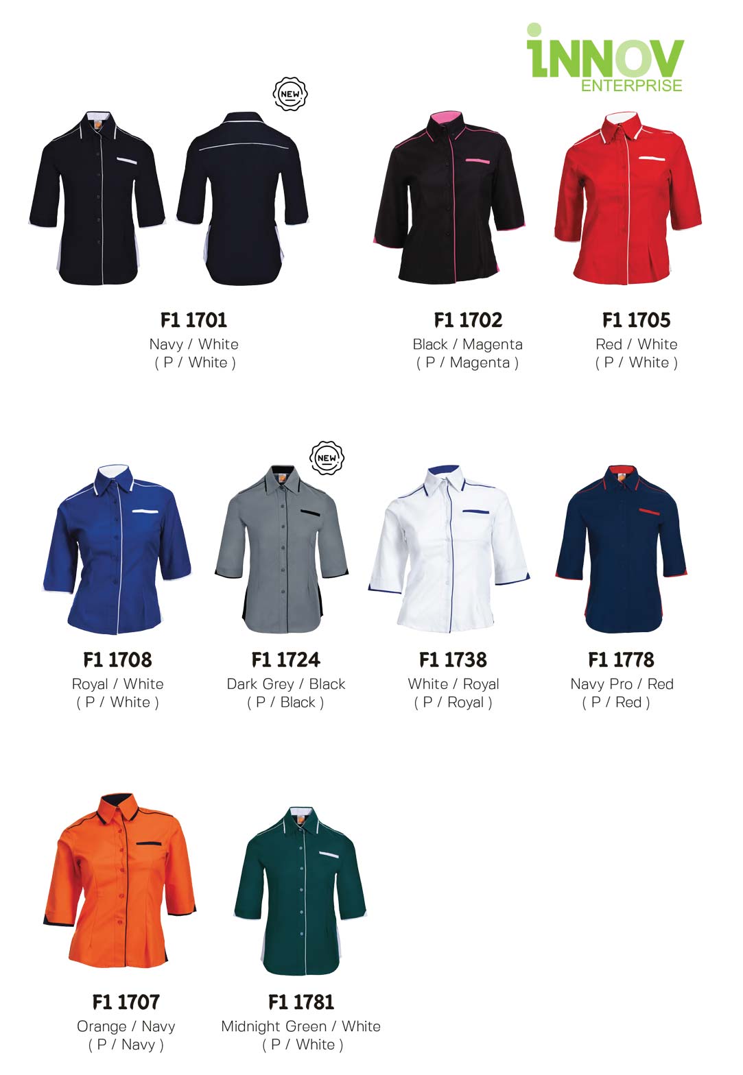 Check out ladies shirt and custom screen print your design our classic shirt design that comes with 5 main colors of black, white, royal blue, orange and red. The design comes with contrasting color tipping on the collar, pocket on the front left chest, front button placket and the sleeves.
