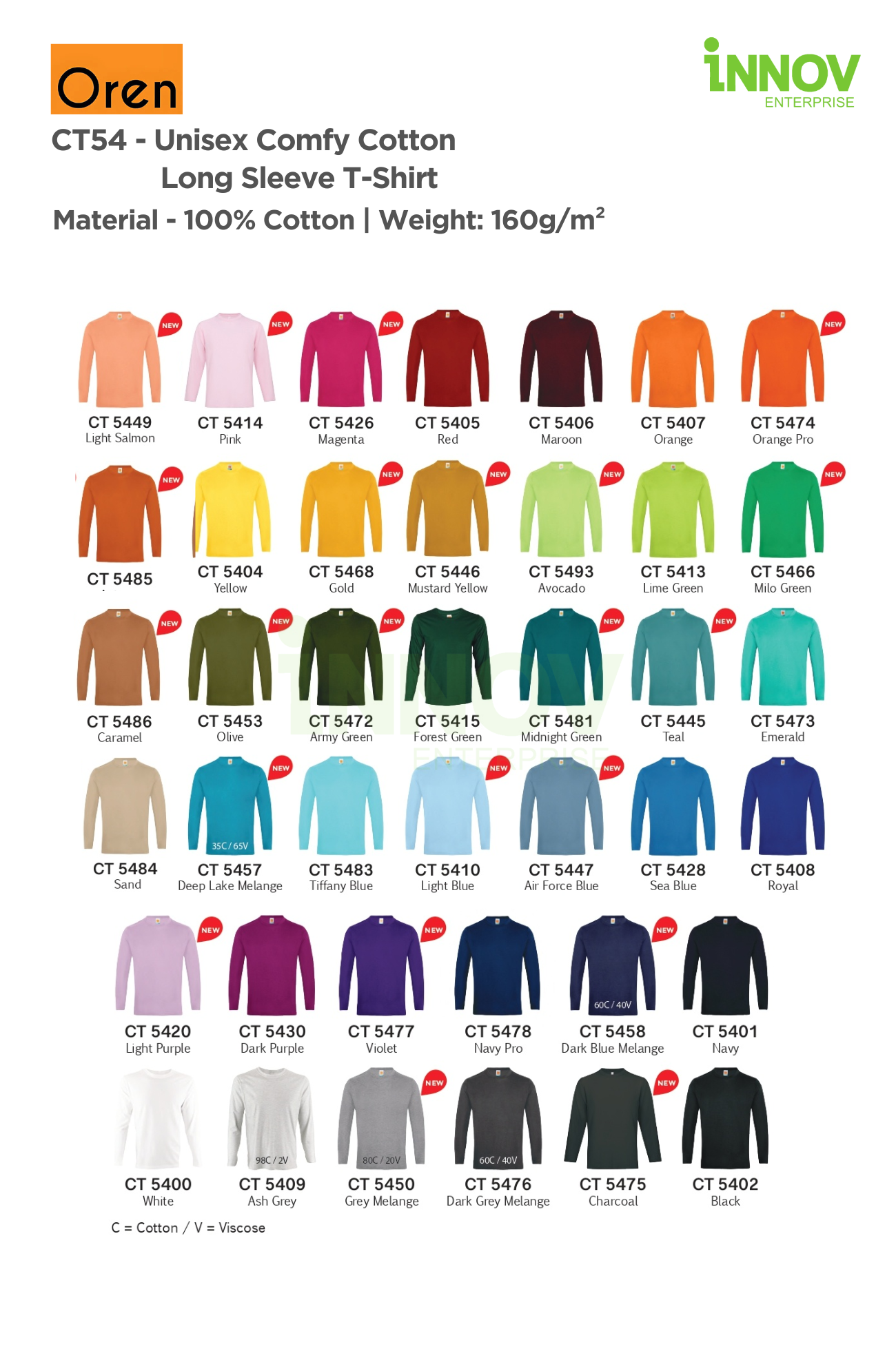 Melange (C:35/V:65) CT 5483 – Tiffany Blue CT 5410 – Light Blue CT 5447 – Air Force Blue CT 5428 – Sea Blue CT 5408 – Royal CT 5420 – Light Purple CT 5430 – Dark Purple CT 5477 – Violet CT 5478 – Navy Pro CT 5458 – Dark Blue Melange (C:60/V:40) CT 5401 – Navy CT 5400 – White CT 5409 – Ash Grey (C:98/V:2) CT 5450 – Grey Melange (C:80/V:20) CT 5476 – Dark Grey Melange (C:60/V:40) CT 5475 – Charcoal CT 5402 – Black |