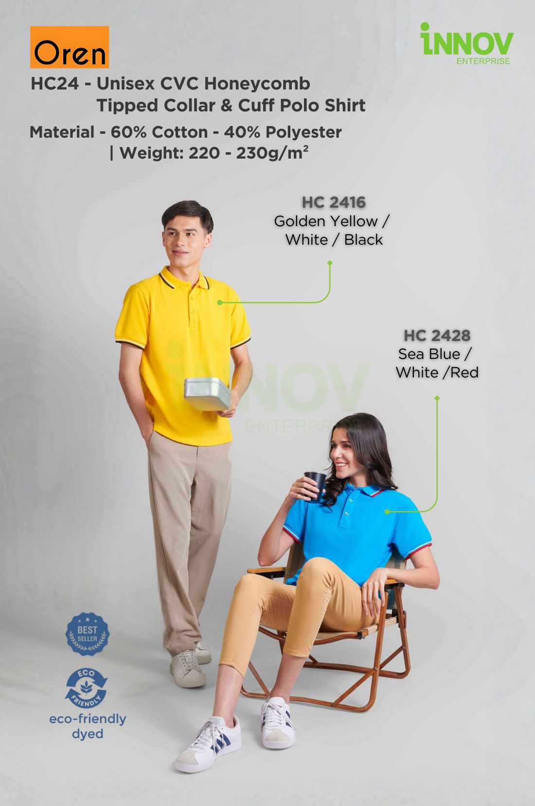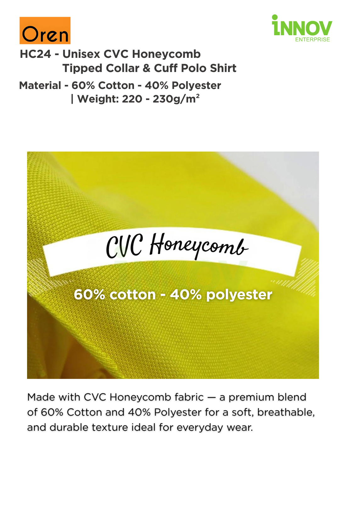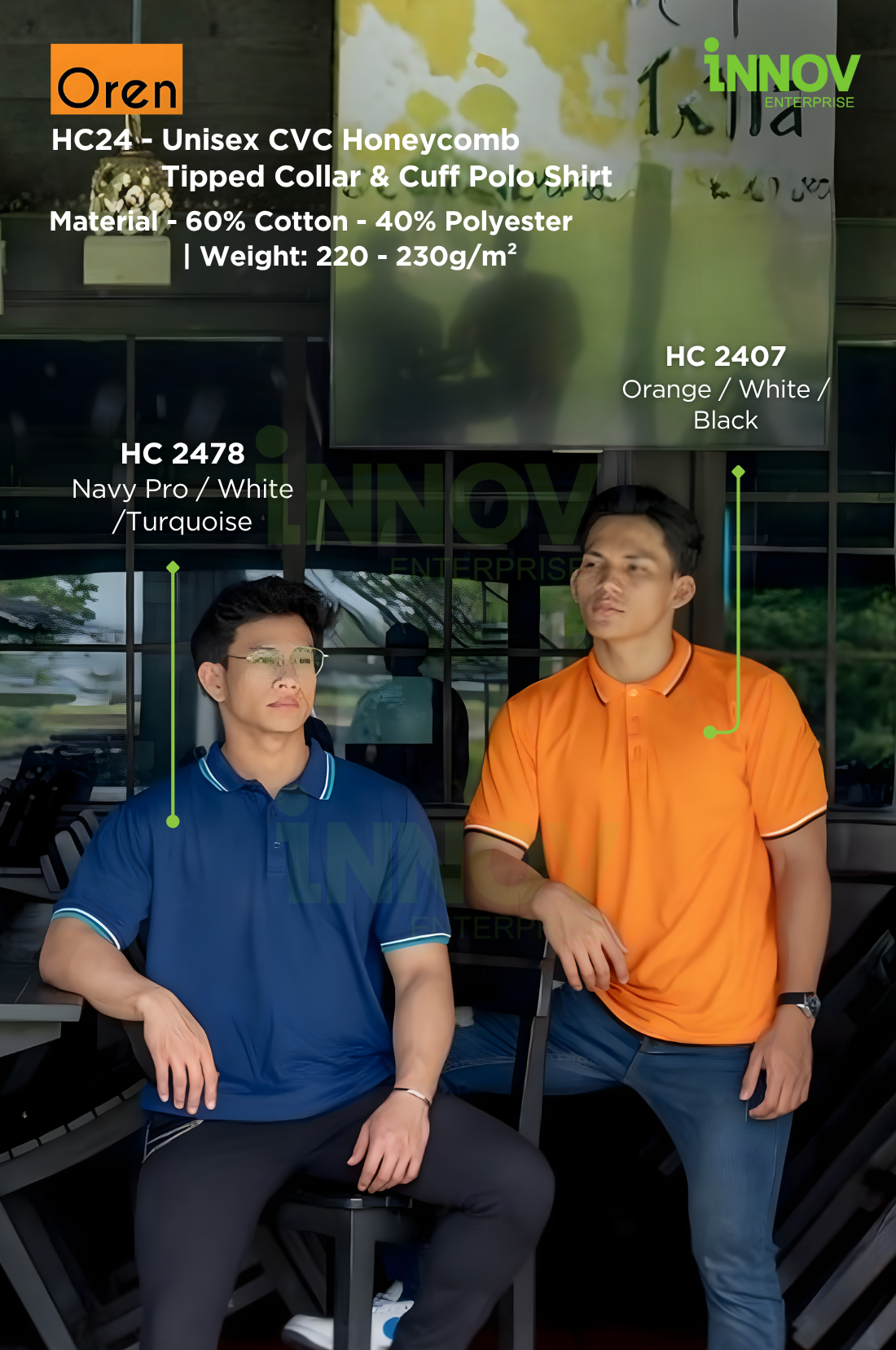 Order Now! Refine your team’s uniform with the HC24 Unisex CVC Honeycomb Tipped Collar & Cuff Polo Shirt — stylish, breathable, and built for lasting comfort. Contact Innov Enterprise today to customise your polo shirts with logo printing or embroidery, and request a free quotation for your next corporate or event order!