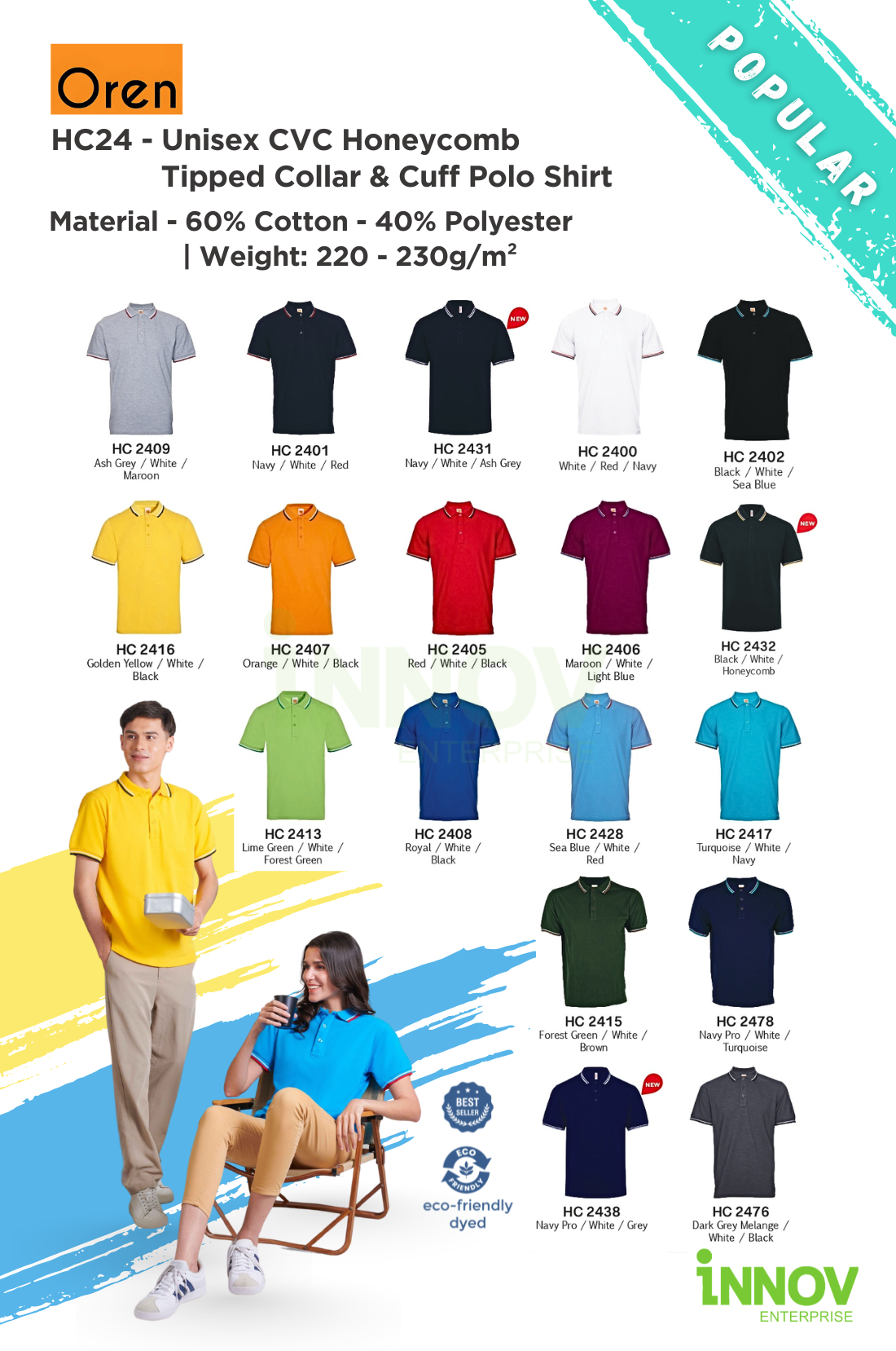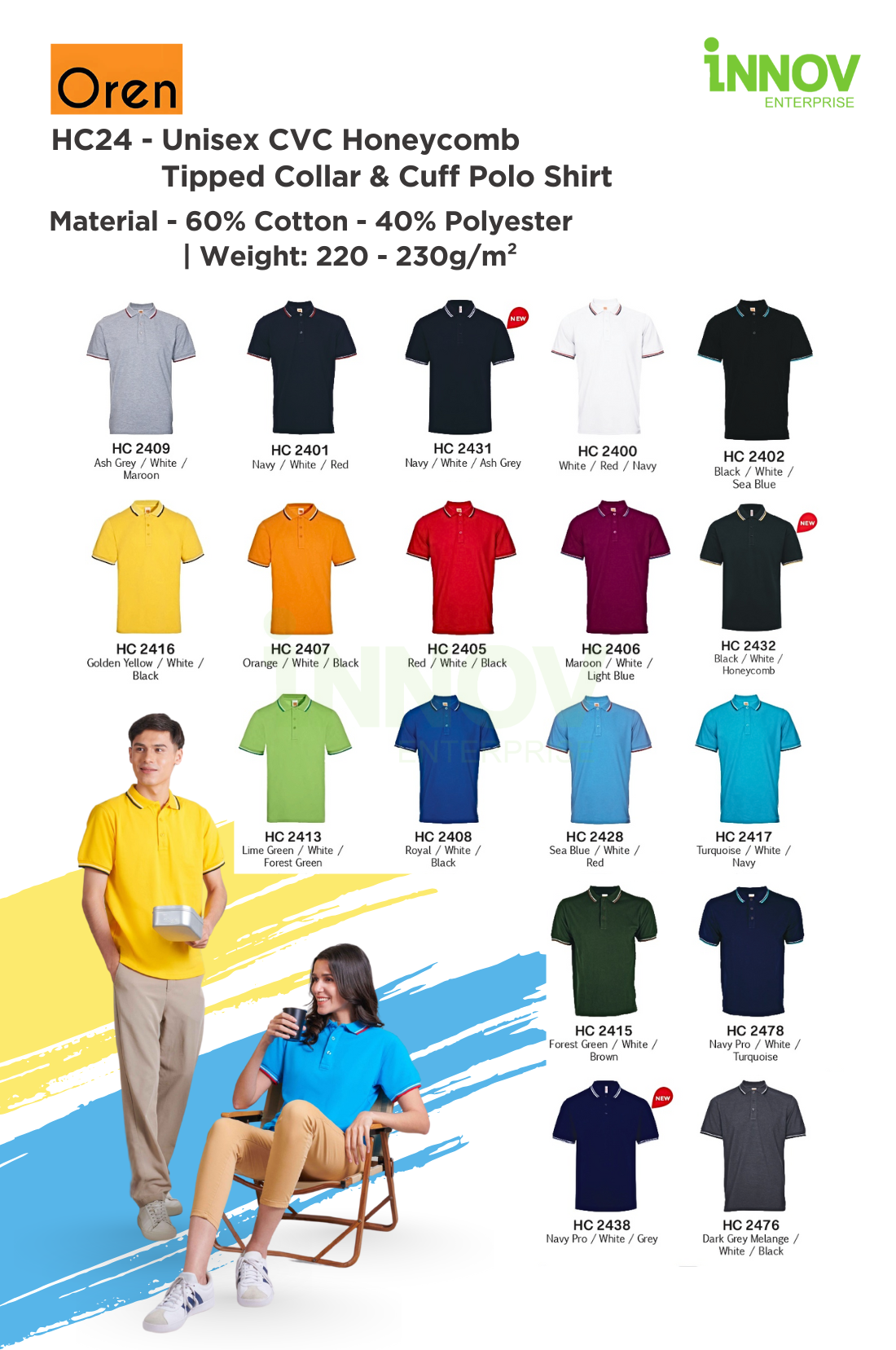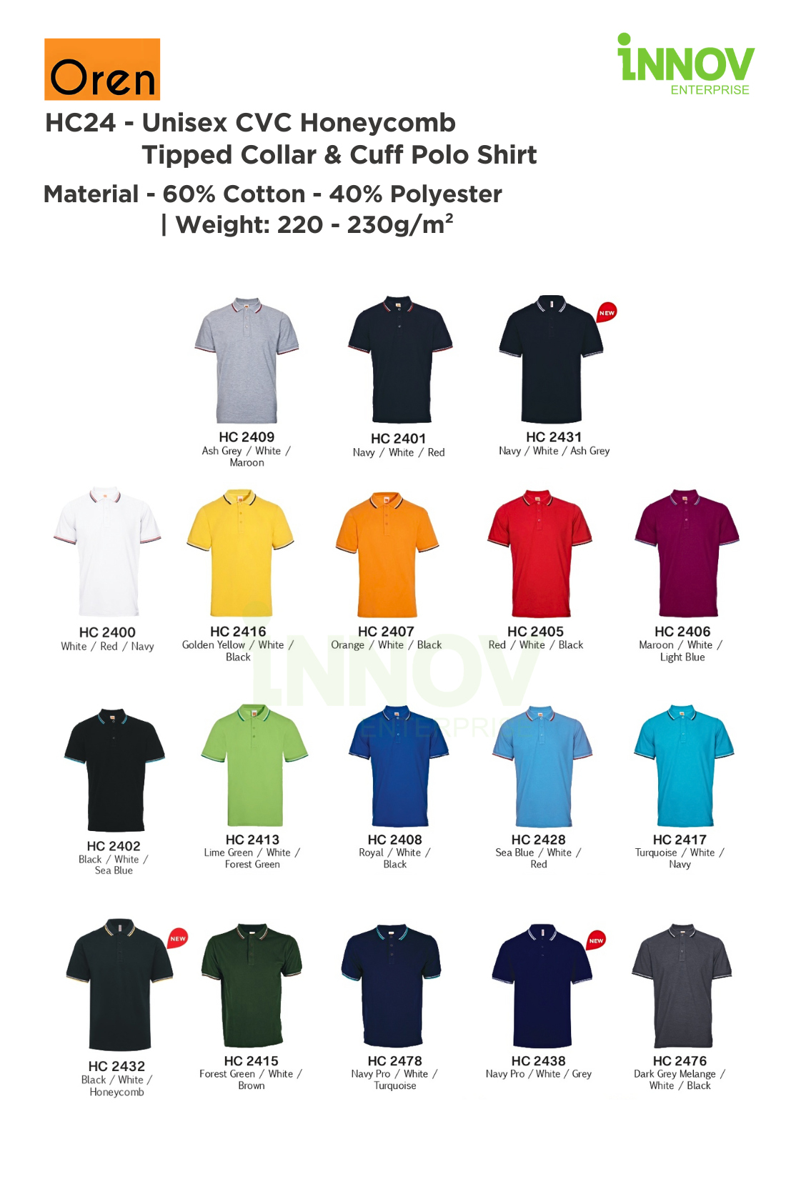 Order Now! Refine your team’s uniform with the HC24 Unisex CVC Honeycomb Tipped Collar & Cuff Polo Shirt — stylish, breathable, and built for lasting comfort. Contact Innov Enterprise today to customise your polo shirts with logo printing or embroidery, and request a free quotation for your next corporate or event order!