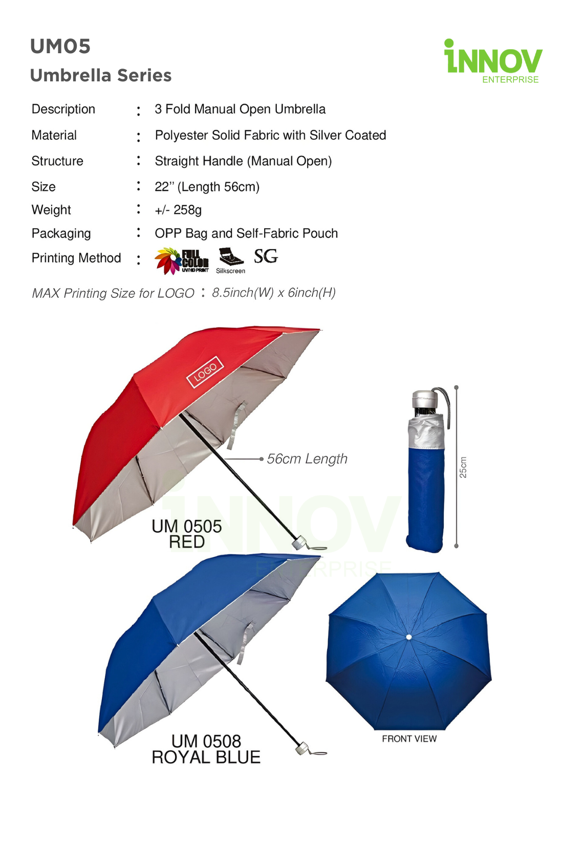 At Innov Enterprise, we offer versatile branding methods to personalise your Manual Umbrella: