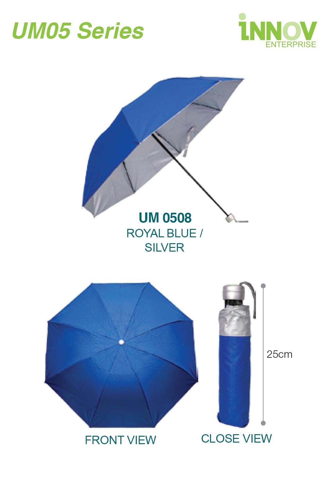 The UM05 Umbrella Series is a compact and reliable Manual Umbrella designed for daily use, gifting, and promotional events. Made from durable polyester with a silver-coated layer, it provides better sun protection while staying lightweight and easy to carry. The 3-fold manual design opens smoothly and folds down to about 25cm, making it convenient to keep in bags. Despite its small size, it opens to 22″ (56cm) for good coverage during rain or sun.