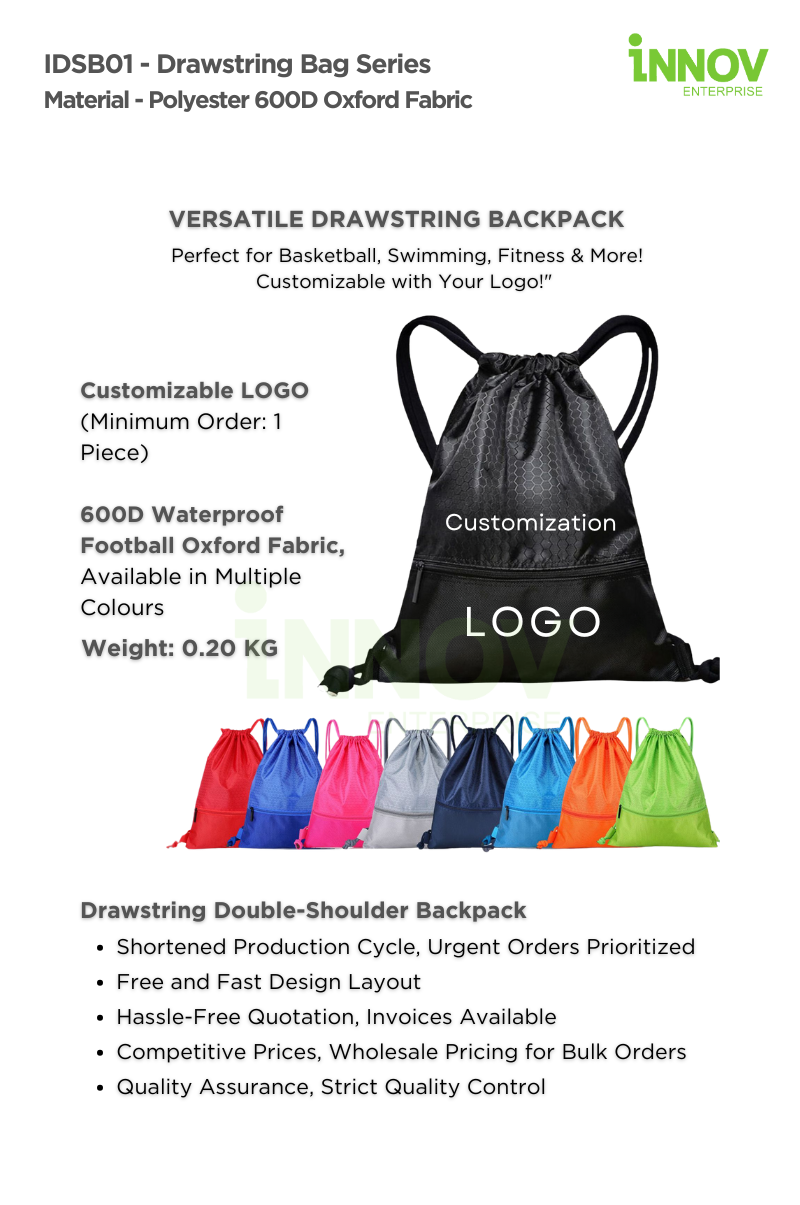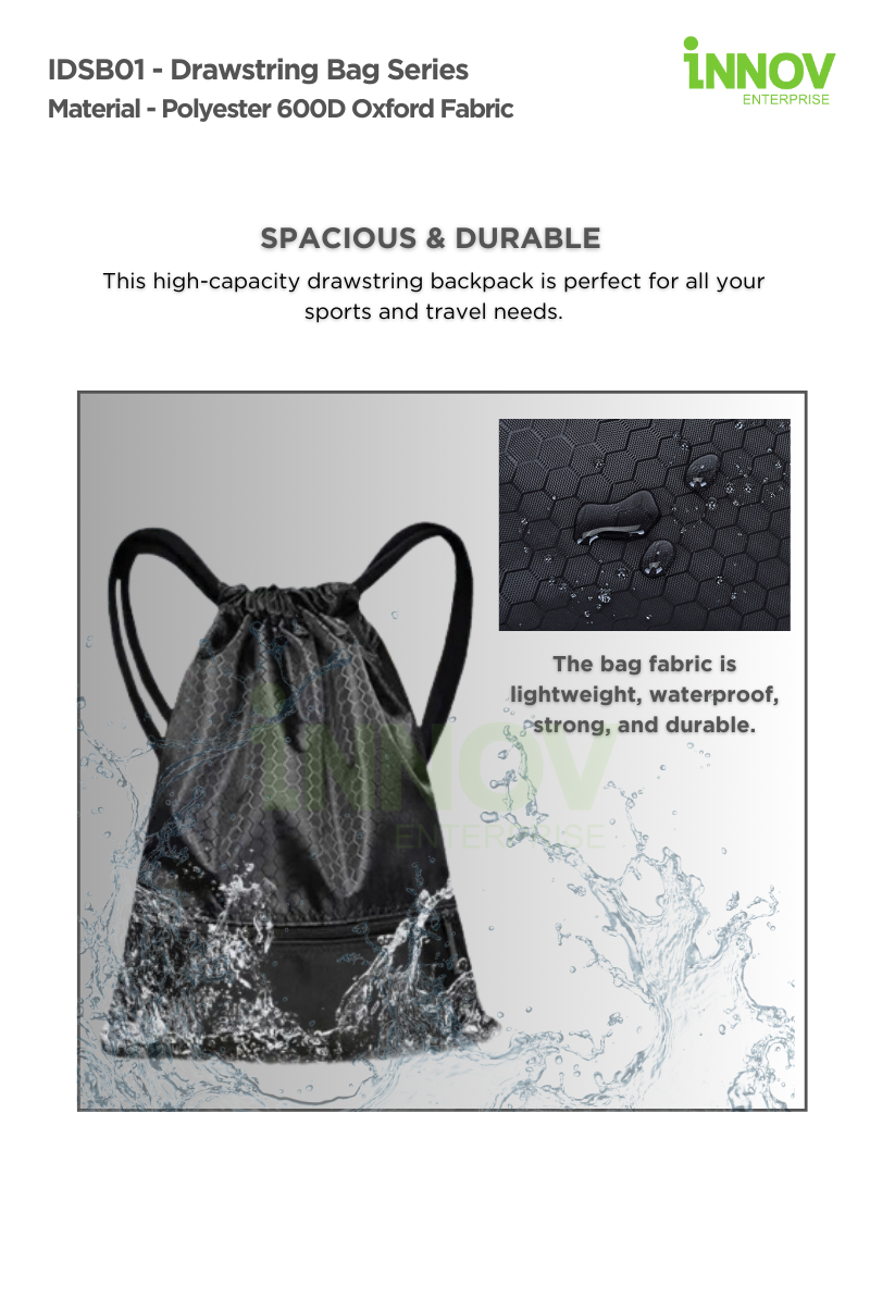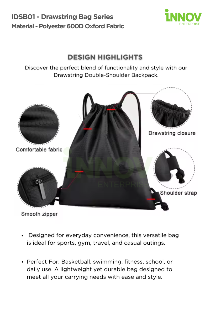The IDSB01 Drawstring Bag Series is a versatile, durable, and stylish storage solution for daily use, sports, gym, travel, and promotions. Made from high-quality Polyester 600D Oxford Fabric , it is lightweight, water-resistant, and breathable, ensuring protection and fresh air circulation. Its spacious interior fits books, shoes, sports gear, toiletries, and electronics, while the drawstring closure offers quick access and a secure fit. Reinforced straps enhance durability for long-term use.