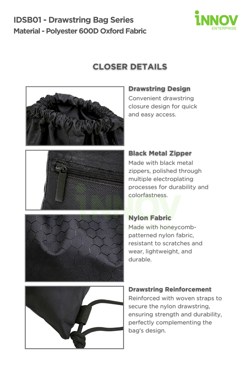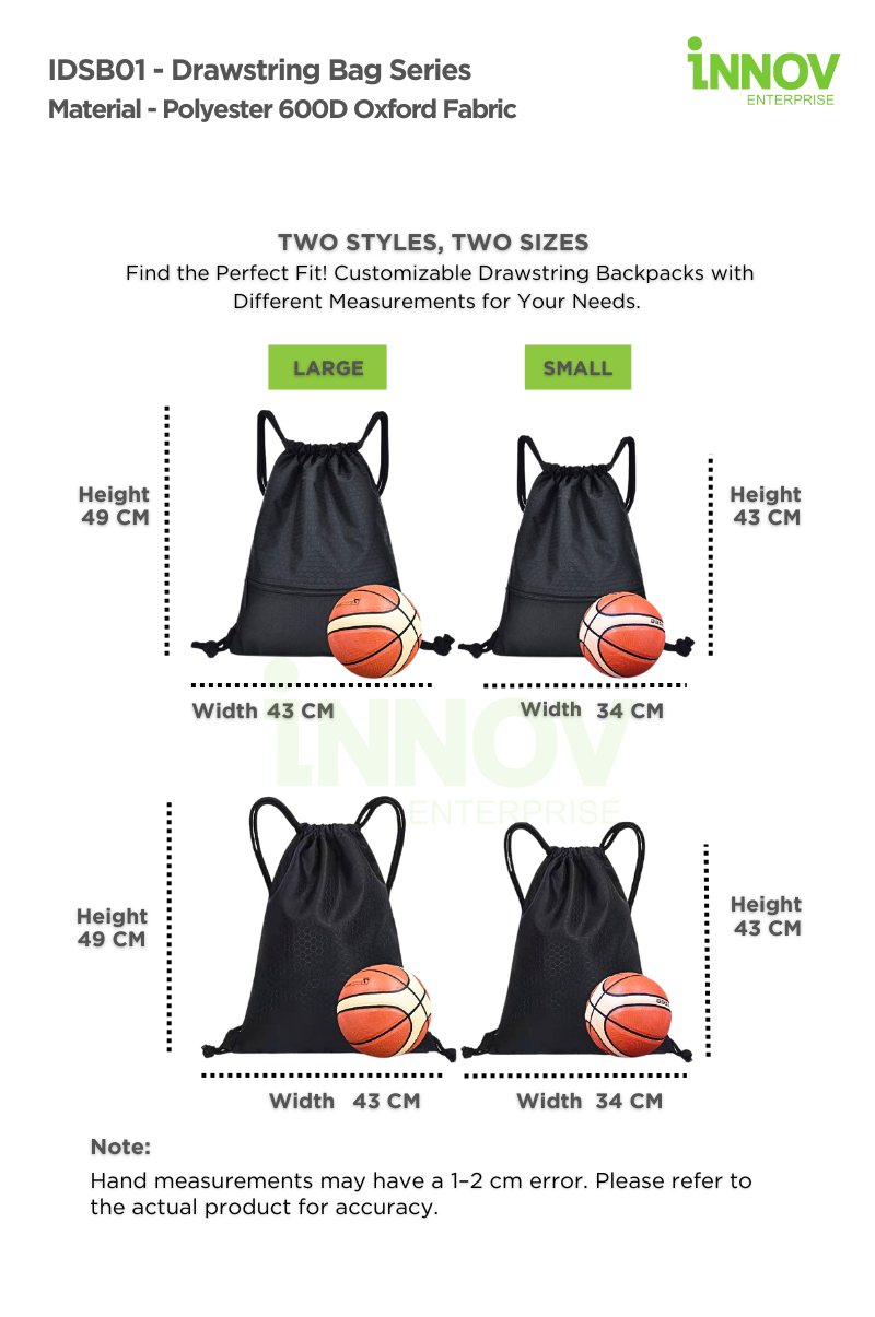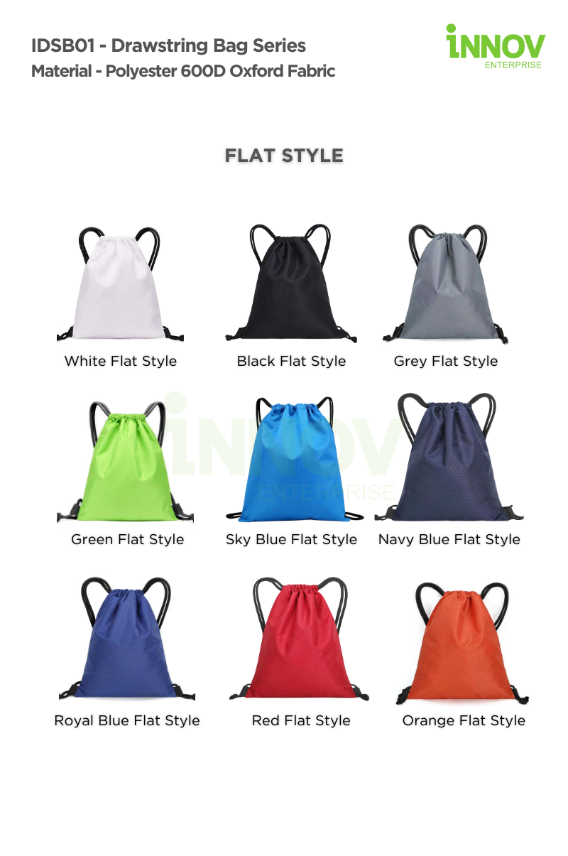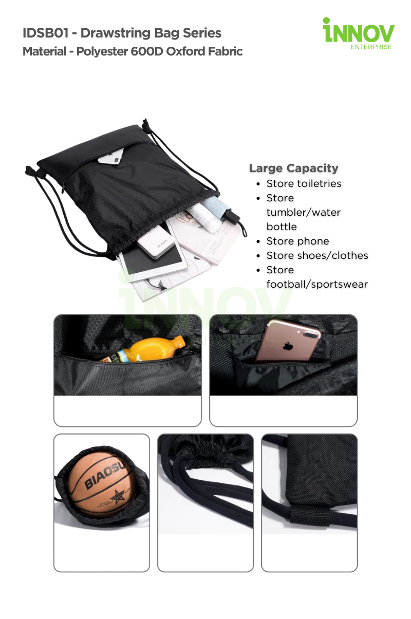 The IDSB01 Drawstring Bag Series is a versatile, durable, and stylish storage solution for daily use, sports, gym, travel, and promotions. Made from high-quality Polyester 600D Oxford Fabric , it is lightweight, water-resistant, and breathable, ensuring protection and fresh air circulation. Its spacious interior fits books, shoes, sports gear, toiletries, and electronics, while the drawstring closure offers quick access and a secure fit. Reinforced straps enhance durability for long-term use.