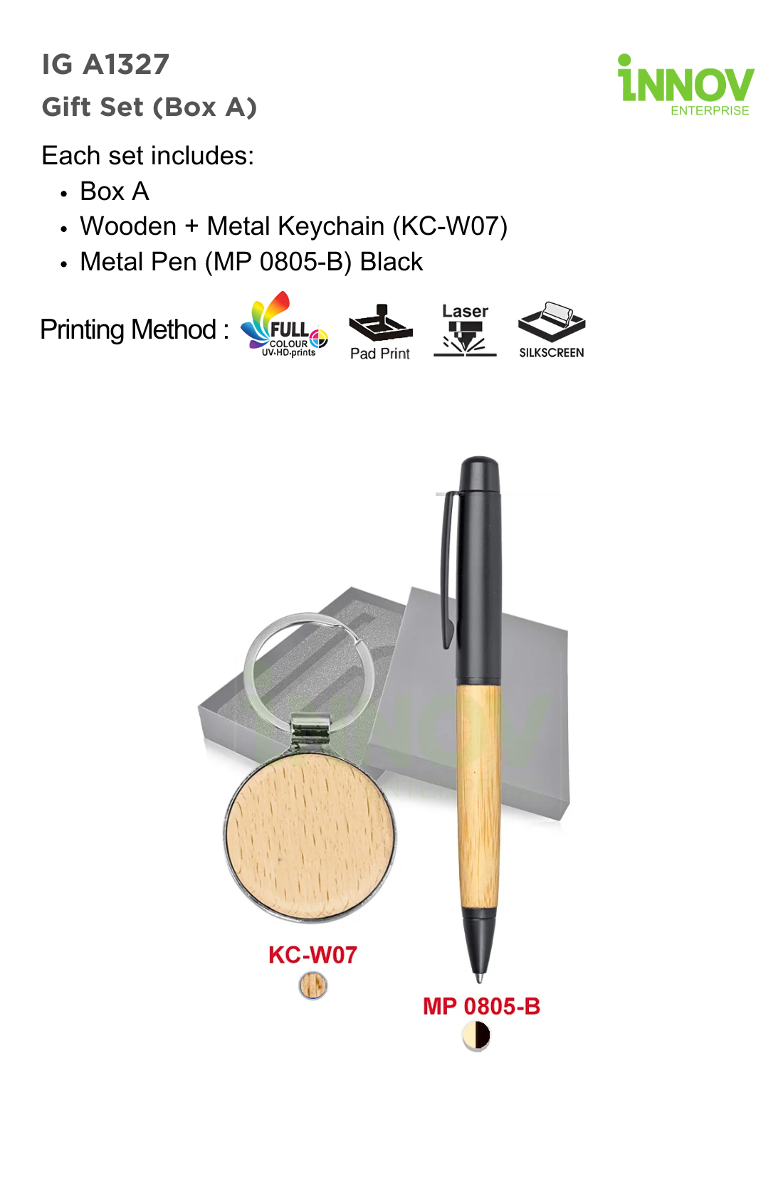 The IG A1327 Gift Set (Box A) is a refined Custom Eco Gift Set for companies seeking sustainable corporate gifts. Supplied and customised by Innov Enterprise, each set includes Box A, a KC-W07 Wooden + Metal Keychain, and an MP 0805-B Metal Pen with wooden barrel detail, neatly presented for a premium finish.