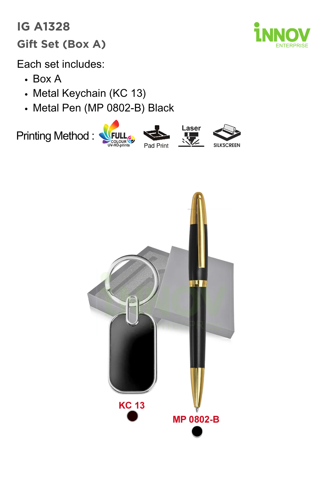 Innov Enterprise applies metal-appropriate branding methods to ensure sharp, durable, and polished results. Customisation is available on the metal pen, metal keychain, and presentation box for a complete branded finish.