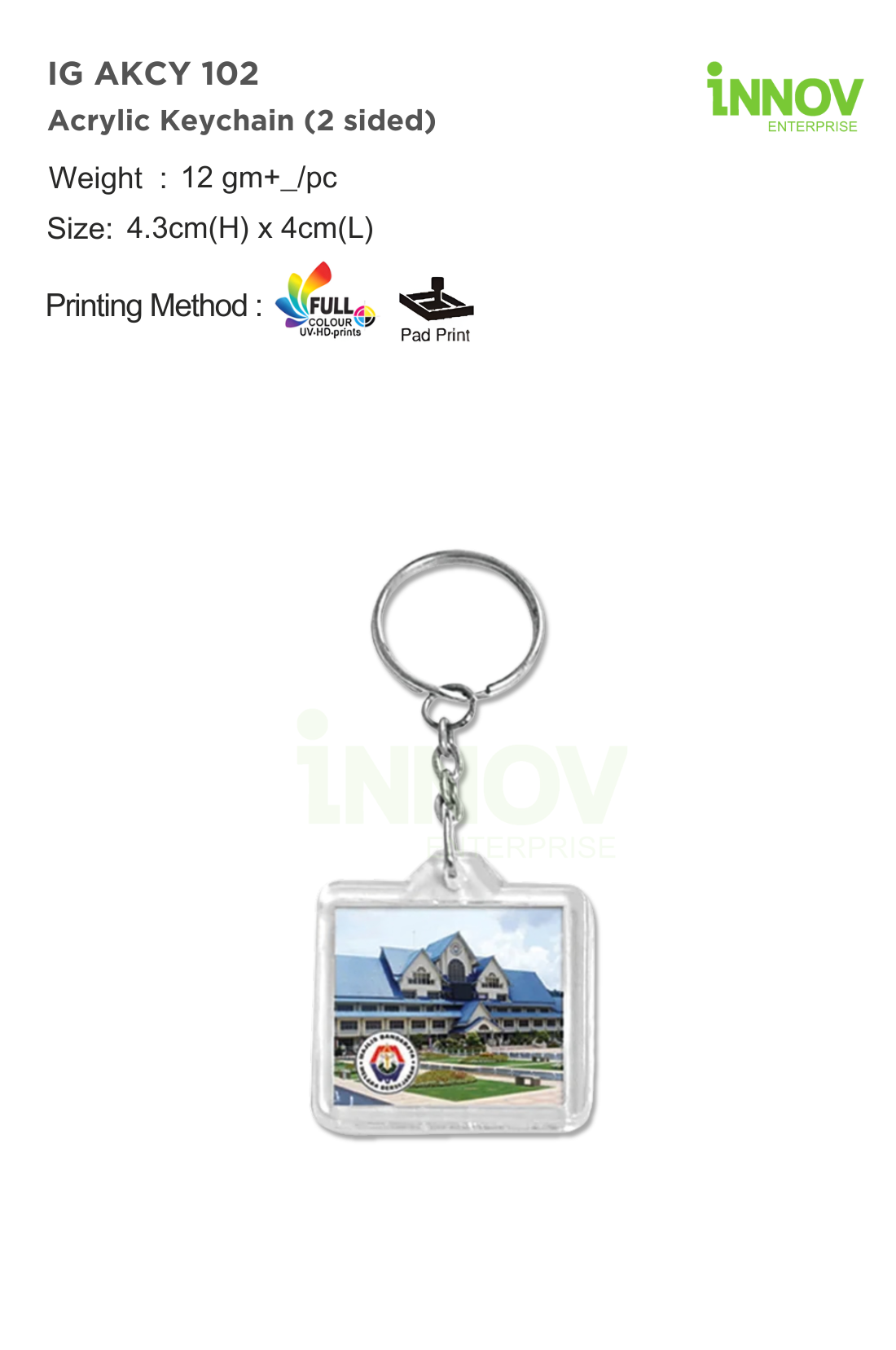 Order Now! Create a practical and memorable Acrylic Personalized Keychain with the IG AKCY 102 Acrylic Keychain (2 Sided). Add to quote or contact Innov Enterprise today for a free quotation and professional branding consultation.