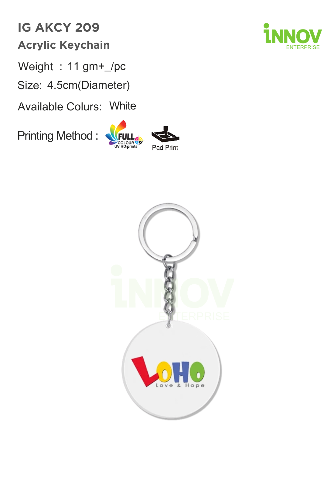 The IG AKCY 209 Acrylic Keychain is a lightweight and durable Custom Acrylic Keychain designed for promotions, corporate gifts, and everyday use. Made from solid white acrylic with a smooth, glossy finish, it provides a clean background that enhances logo clarity and colour vibrancy—making branding more eye-catching compared to transparent or coloured bases. Its round shape offers balanced visibility on both sides while remaining comfortable to carry.