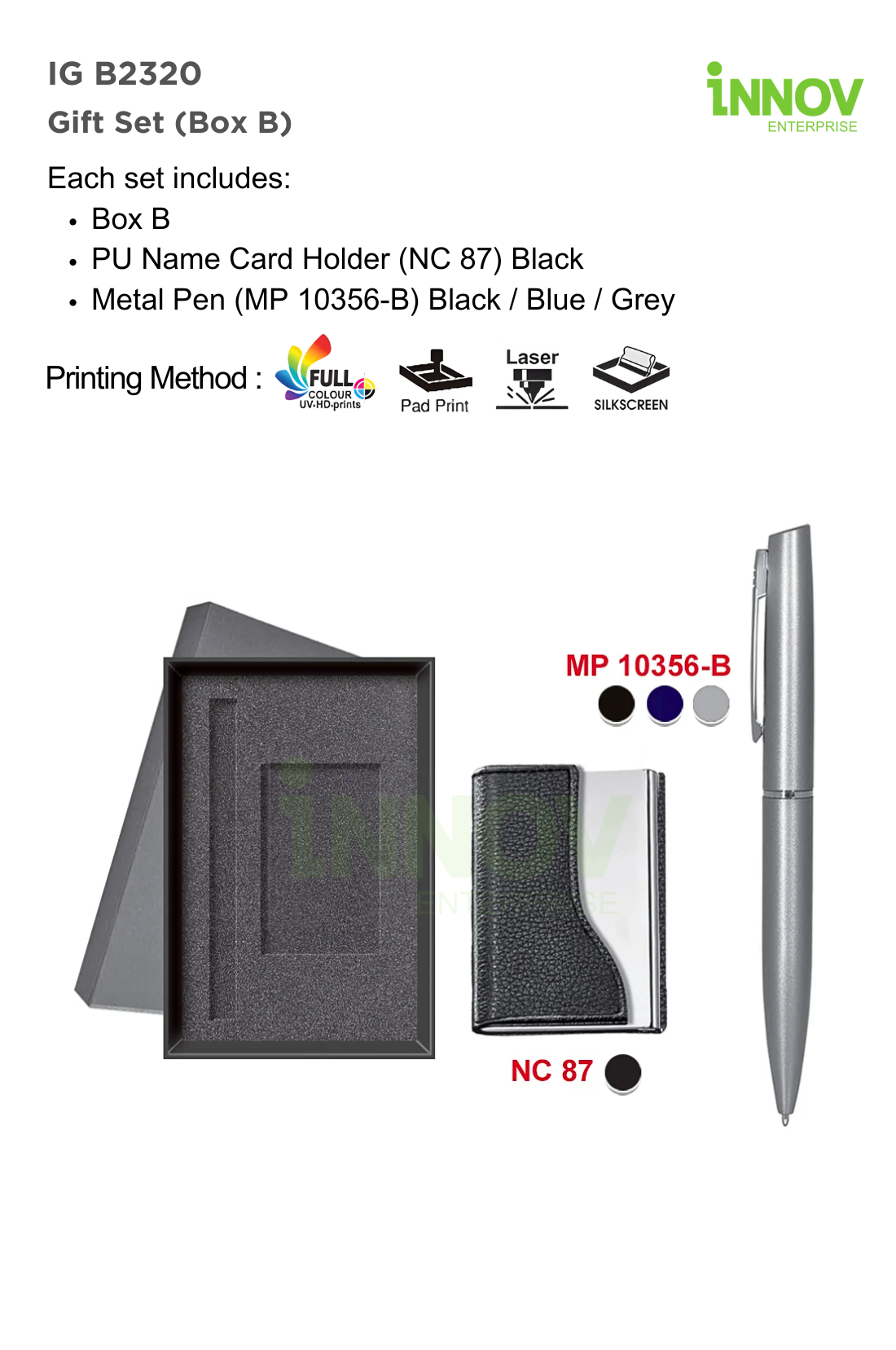 The IG B2320 Gift Set (Box B) is a refined Wholesale Custom Gift Set for corporate branding and promotional campaigns. Supplied and customised by Innov Enterprise, each set includes Box B, a PU Name Card Holder (NC 87) in Black, and an MP 10356-B Metal Pen, neatly presented for a professional finish.
