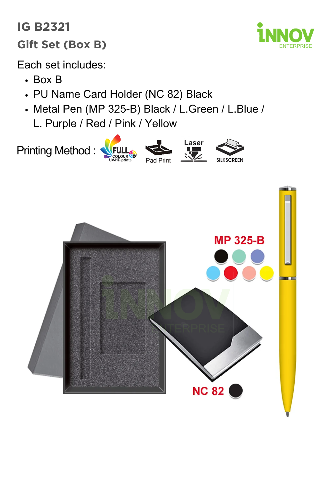 The IG B2321 Gift Set (Box B) is a stylish Custom Souvenir Gift Set for business events, seminars, and corporate campaigns. Supplied and customised by Innov Enterprise, each set includes Box B, a PU Name Card Holder (NC 82) in Black, and an MP 325-B Metal Pen available in multiple colours, neatly presented for a professional finish.