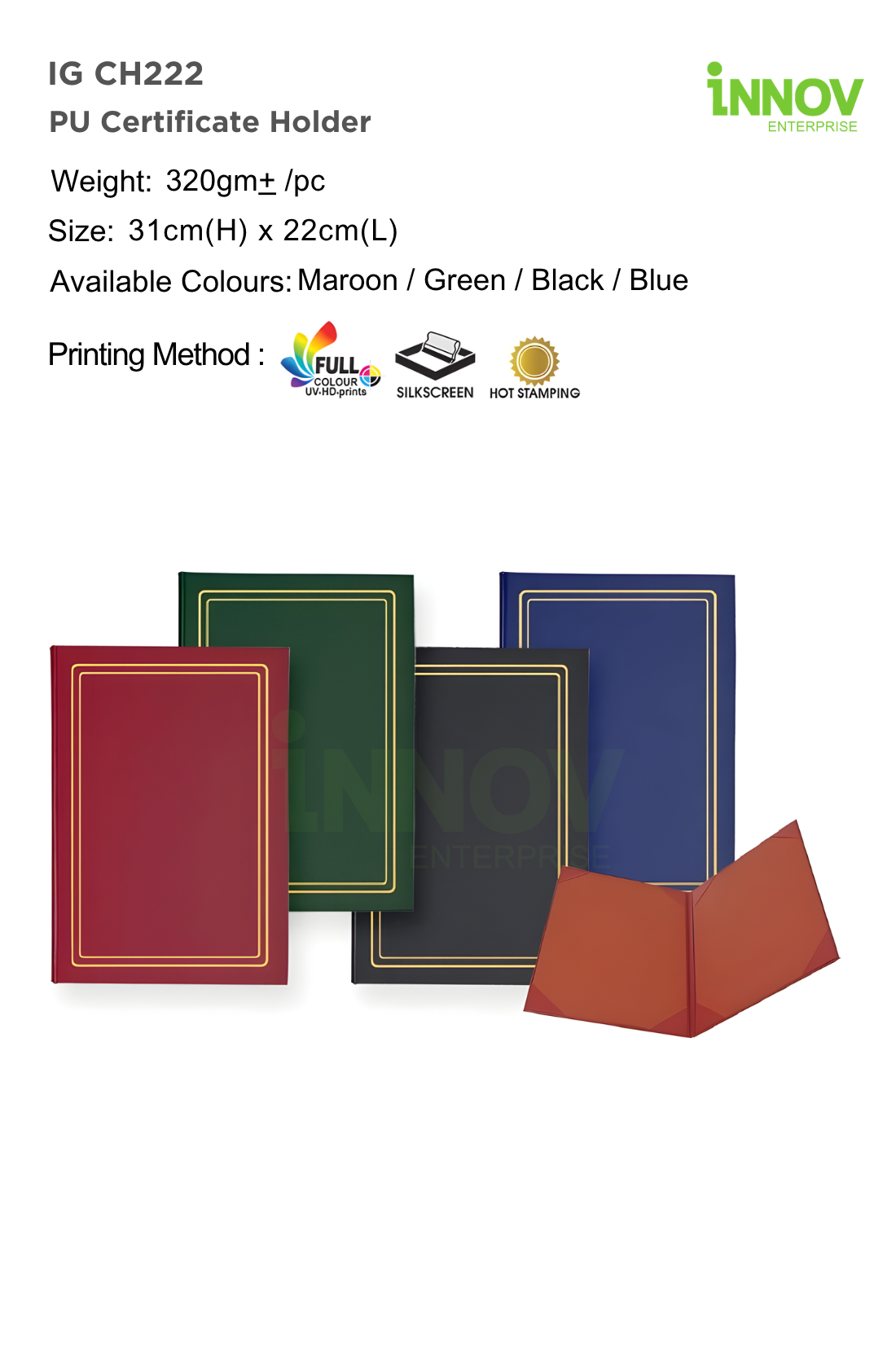The IG CH222 PU Certificate Holder is a premium option for Certificate Holder Printing, ideal for presenting awards, diplomas, and documents professionally. Supplied and customised by Innov Enterprise, it features a refined PU finish with gold border detailing for an elegant look.