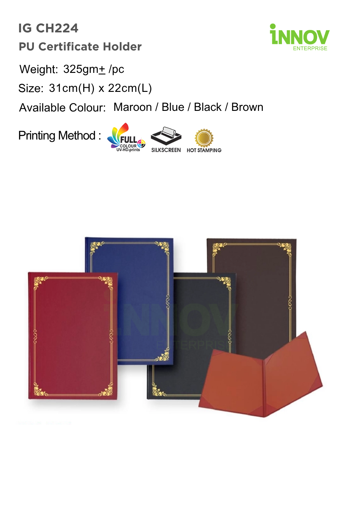 The IG CH224 PU Certificate Holder is a refined Customised PU Certificate Holder ideal for presenting diplomas, awards, and certificates. Supplied and customised by Innov Enterprise, it is made from high-quality PU with a smooth, durable finish and gold border detailing for a premium look.