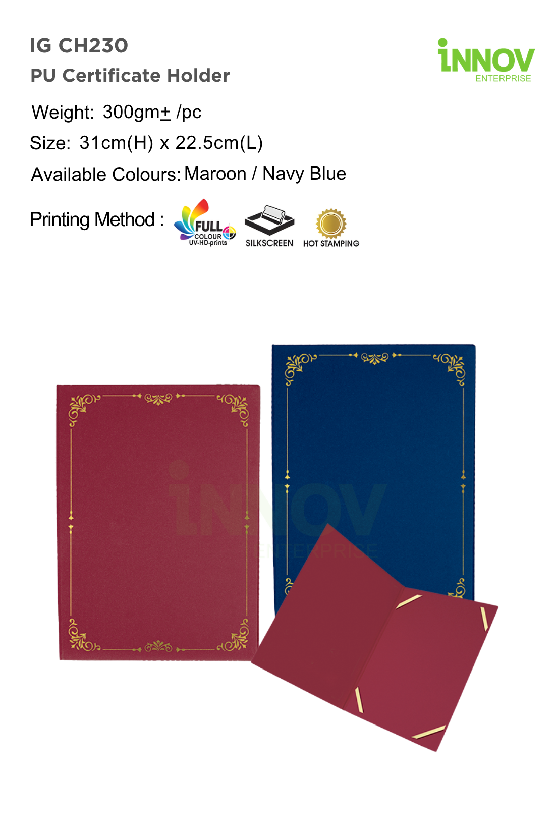 The IG CH230 PU Certificate Holder is an elegant Personalised Certificate Holder ideal for presenting awards and diplomas. Supplied and customised by Innov Enterprise, it features a premium PU leatherette finish with gold border detailing for a refined look.
