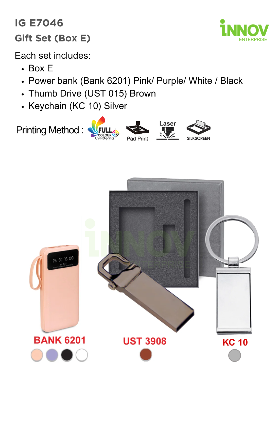 The IG E7046 Gift Set (Box E) is a practical Tech Gift Set with Logo designed for corporate promotions, marketing campaigns, and client appreciation. Supplied and customised by Innov Enterprise, the set includes Box E, a Bank 6201 Power Bank, UST 3908 Thumb Drive, and KC 10 Metal Keychain, neatly arranged in a premium presentation box.