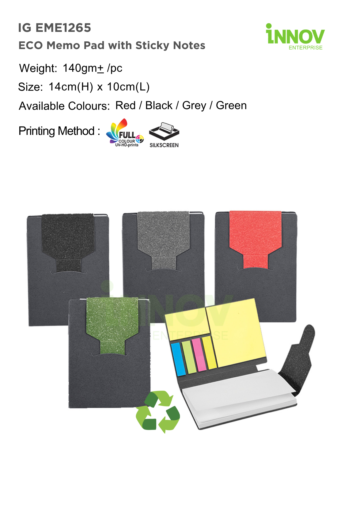 The IG EME1265 ECO Memo Pad with Sticky Notes is a practical Custom Memo Pad Set ideal for organised note-taking and corporate branding. Supplied and customised by Innov Enterprise, it measures 14 cm × 10 cm with an approximate weight of 140 g, offering a portable yet spacious design.
