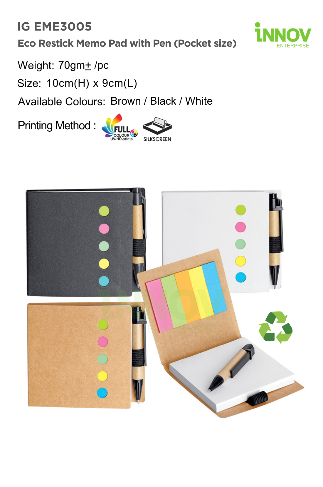 The IG EME3005 Eco Restick Memo Pad with Pen (Pocket Size) is a compact Custom Eco Memo Pad with Pen ideal for note-taking and promotions. Supplied and customised by Innov Enterprise, it measures 10 cm × 9 cm with an approximate weight of 70 g, making it easy to carry.